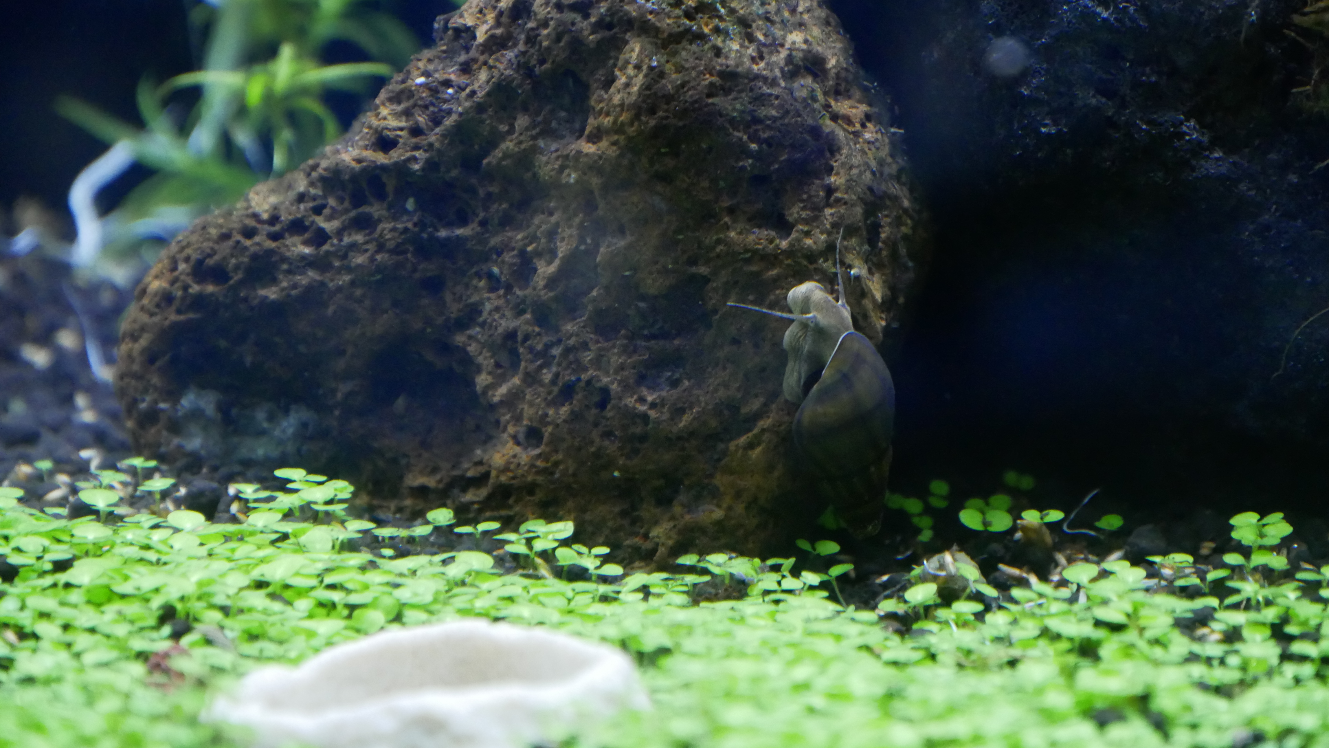 이건 현재 수조의 모습인데요. 앞에 이끼가 많이 있어서 수초가 잘 안보이긴 하지만, 수초는 확실히 일자로 쫙 펴진 모습이죠? 그리고 처음 심었을때에 비해서 발색도 많이 올라왔습니다. 그리고 워터코인도 자리를 잘 잡았습니다.
