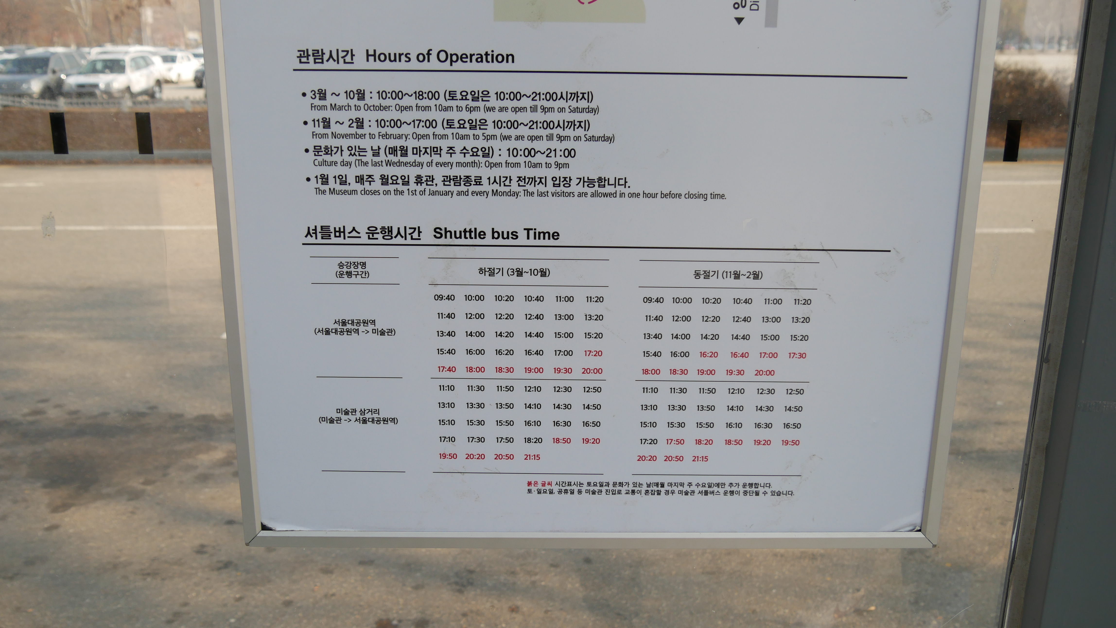 승차장 내부에는 이렇게 안내표지판도 있습니다. 버스 운행하는 경로와 하절기, 동절기에 따라 버스 시간표가 있습니다. 그래서 미술관에서 나올때 이 시간표를 보고 나오는 시간을 정하는게 좋습니다.