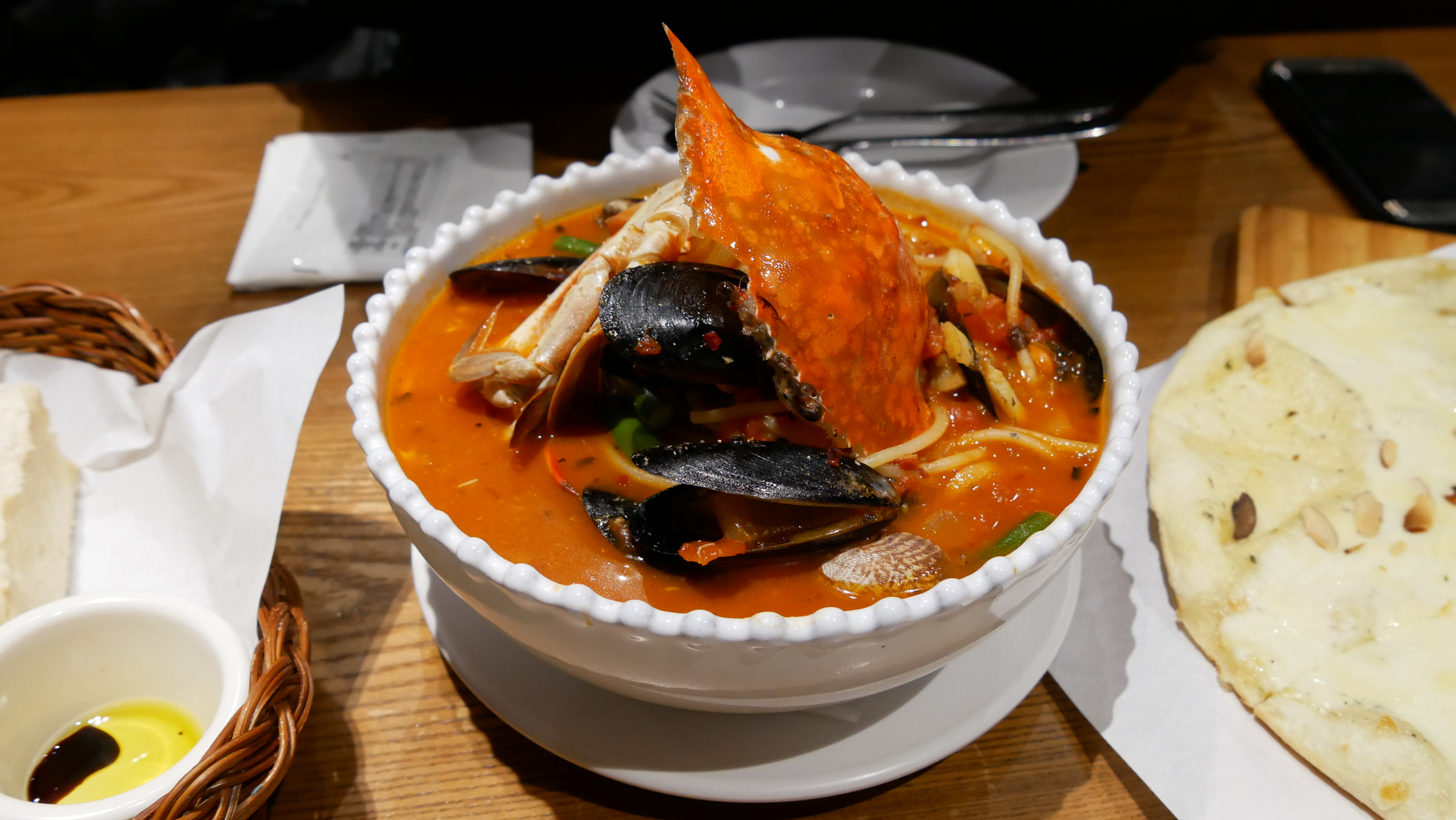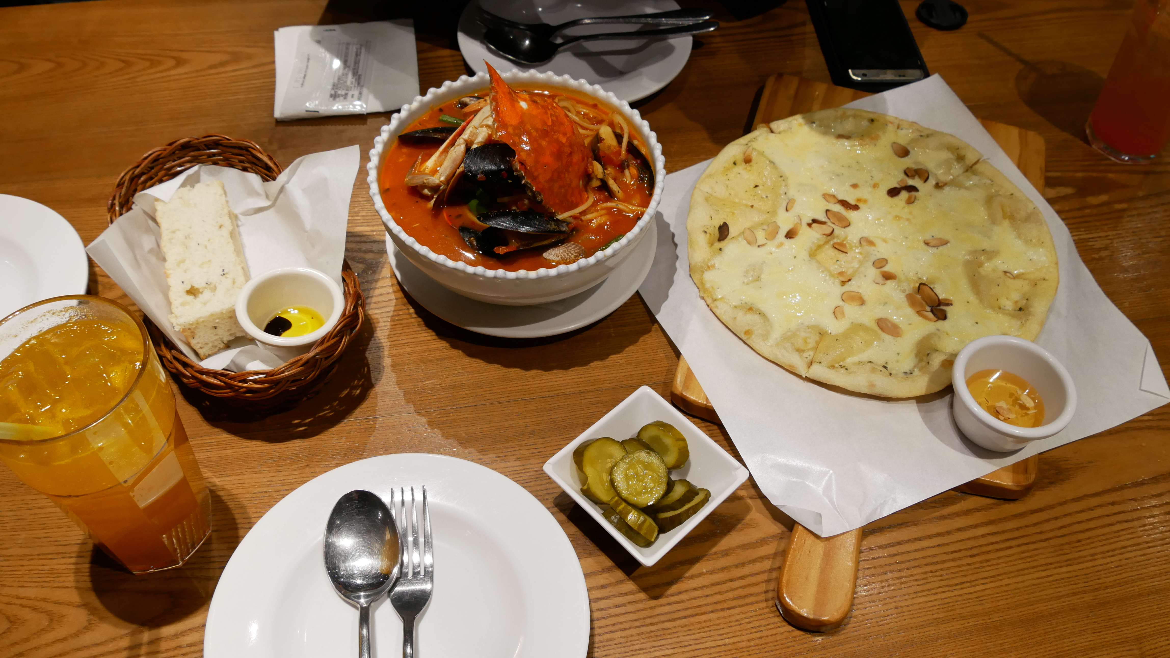 그리고 다음으로 나온 메뉴가 씨푸드 국물 파스타인데요. 이건 정말 특이한 맛이였습니다. 얼추 비쥬얼로 보면 짬뽕과 같은 느낌인데요. 해물이 많이 들어가 있었고, 면은 파스타면입니다. 그런데 일반 짬뽕과 다른게 토마토가 들어간 베이스로 국물을 만들었기 때문에 시큼한 맛이 있으면서 매콤한 맛이 꽤 특이하면서 맛있더라고요.