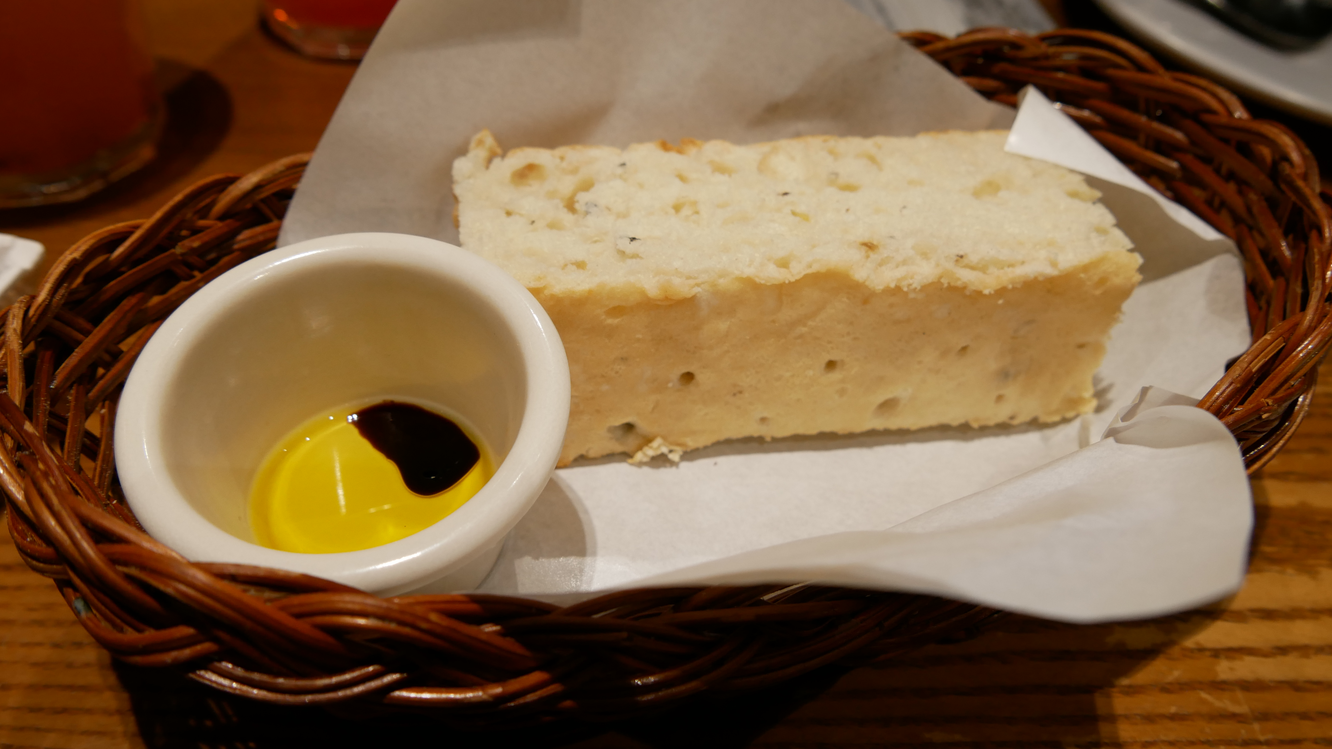 그리고 식전방인데요. 생각보다 큰 빵이더라고요. 그리고 올리브 오일에 발사믹 소스가 들어간 것 같았습니다. 리미니 식전빵이 생각보다 맛있었습니다. 고소하면서 깔끔한 맛이 빵만 먹어도 꽤 맛있었습니다.