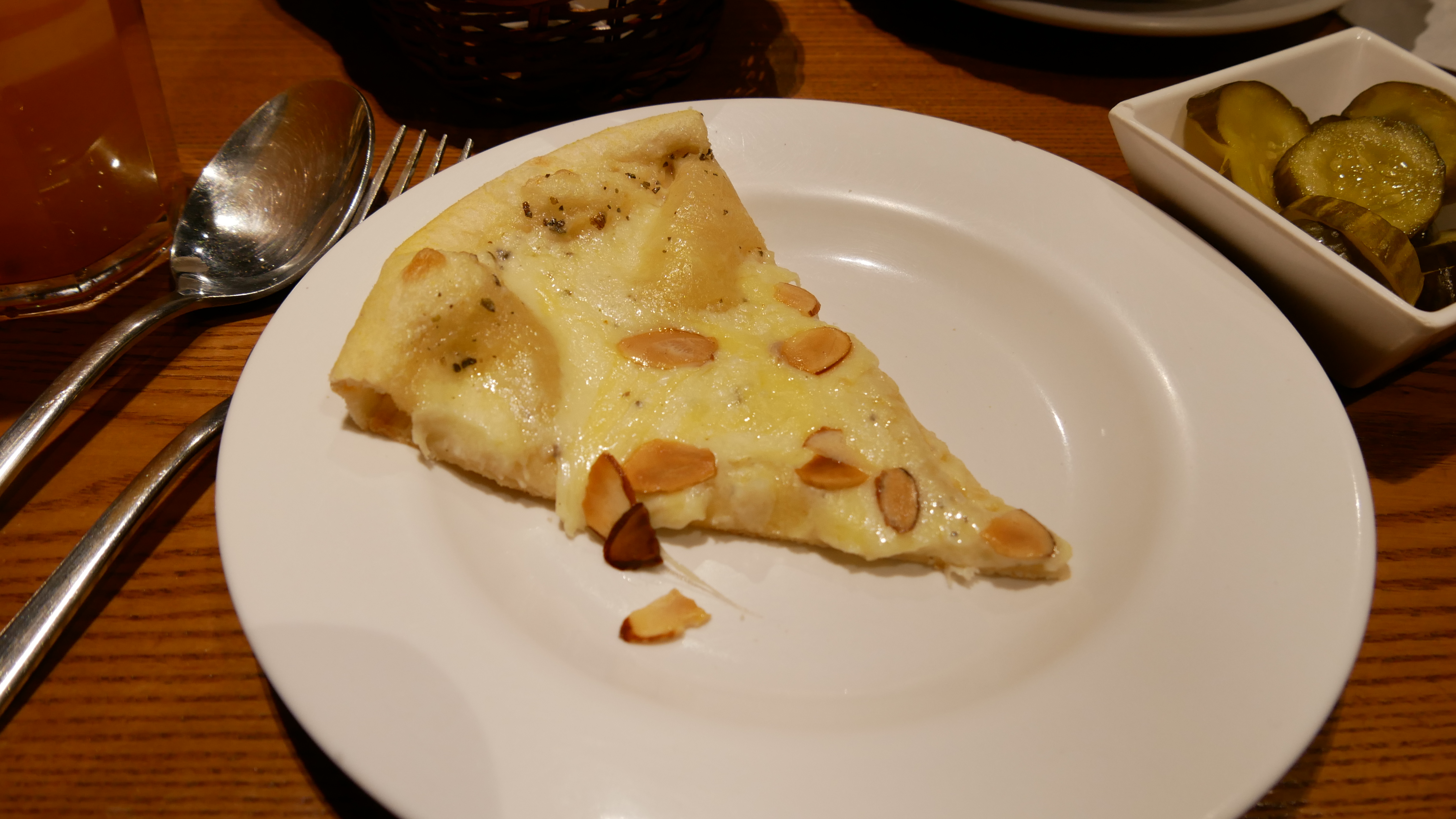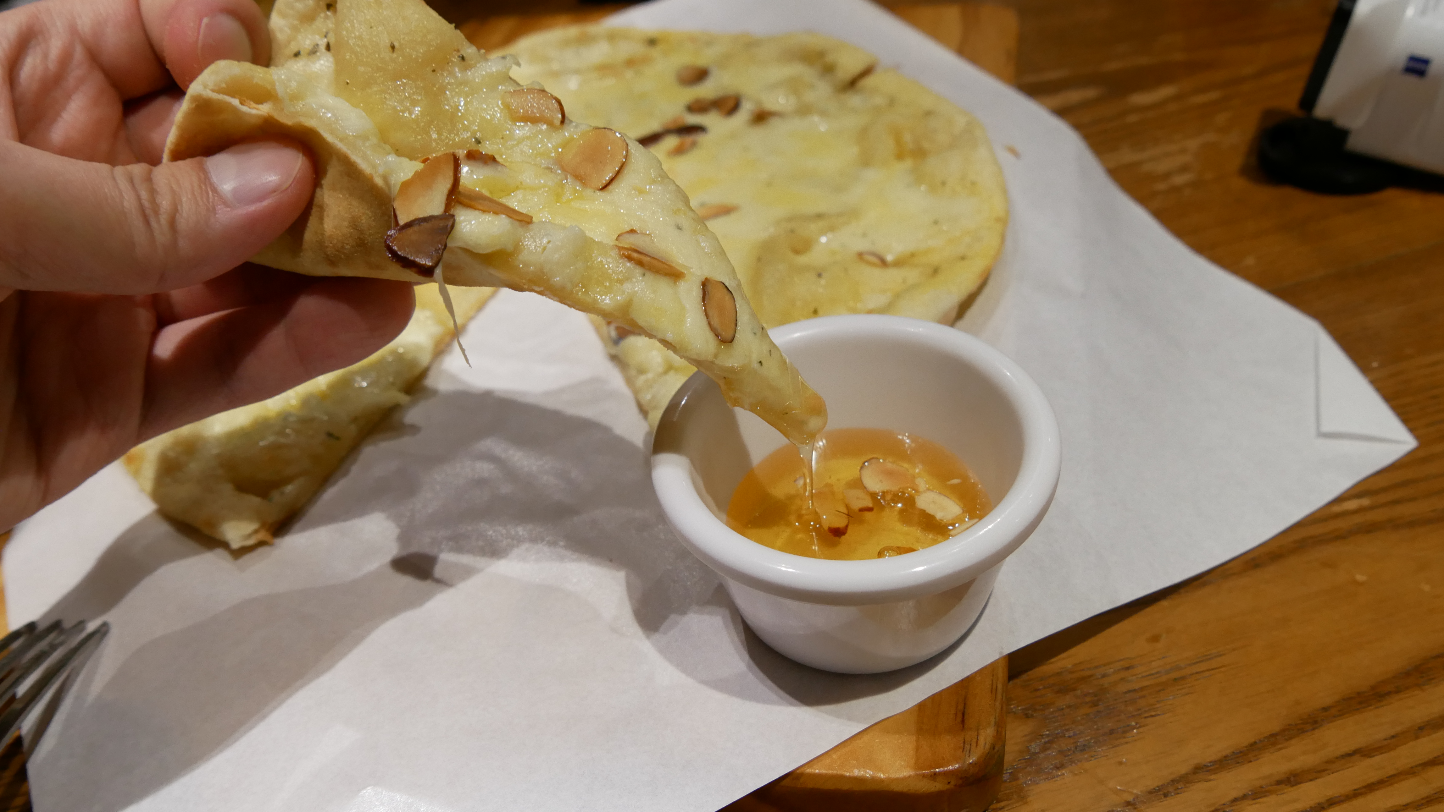 그리고 고르곤졸라가 나왔는데요. 이곳은 식전빵도 그렇고 빵들이 꽤 맛있었습니다. 일반적으로 고르곤졸라 못하는 집가면 도우가 너무 맛이 없는 경우가 있는데요. 도우가 맛있어서 전체적으로 맛이 탄탄한게 좋았습니다. 그리고 재료도 아낌없이 들어가서 좋았습니다. 꿀에도 아몬드 슬라이스가 들어 있었습니다.
