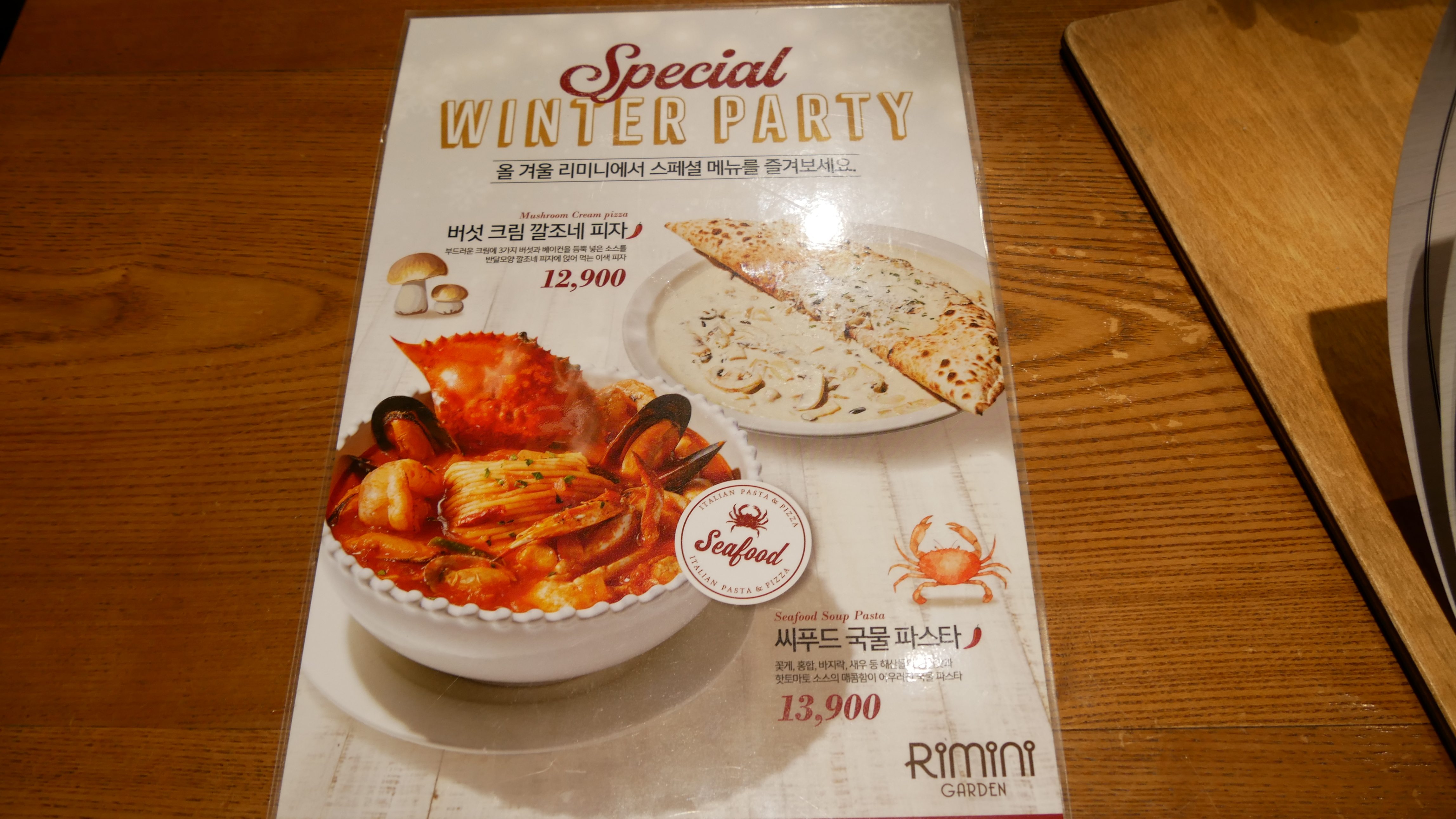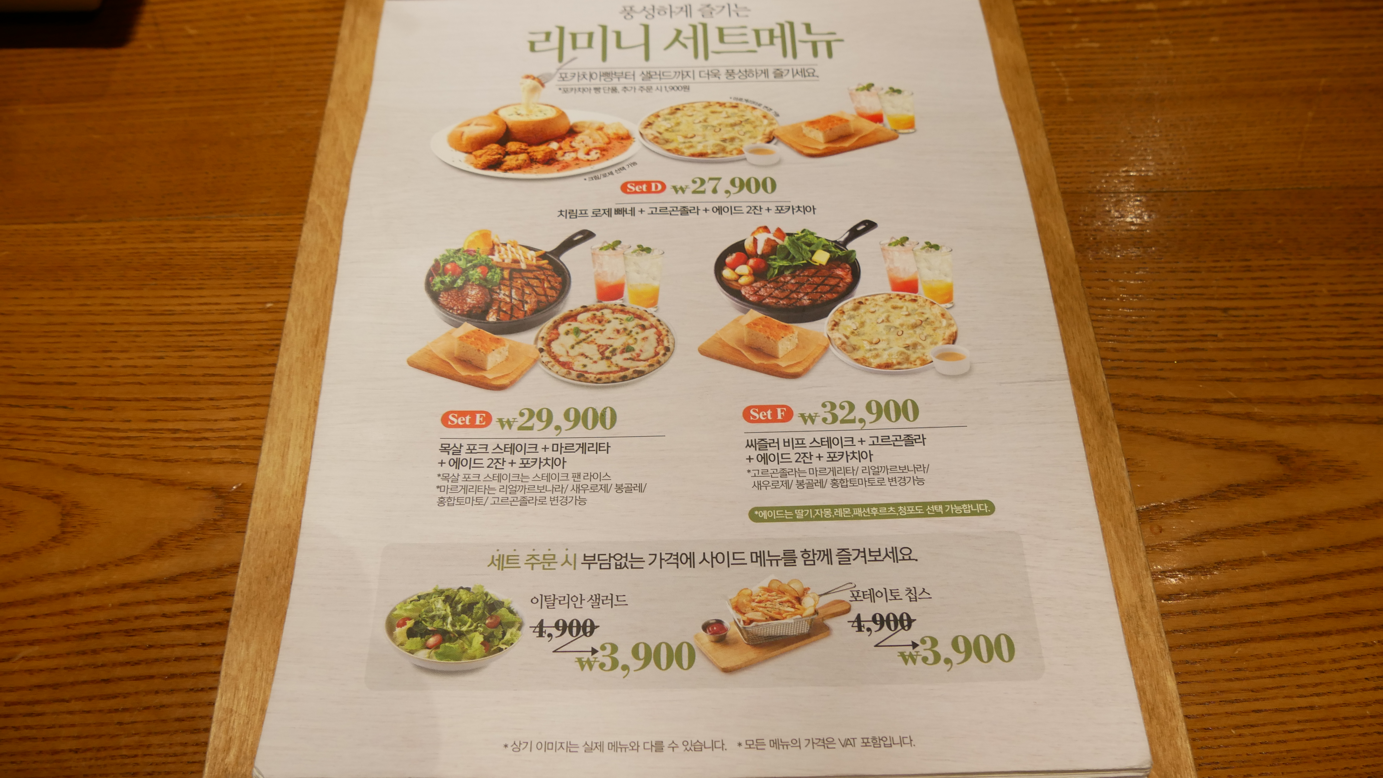 그리고 일반메뉴판입니다. 리미니세트메뉴가 있는데요. 피자 + 파스타 혹은 피자 + 스테이크 메뉴가 기본입니다. 그리고 세트메뉴를 주문하게 되면 사이드메뉴 가격이 할인된다고 하네요.