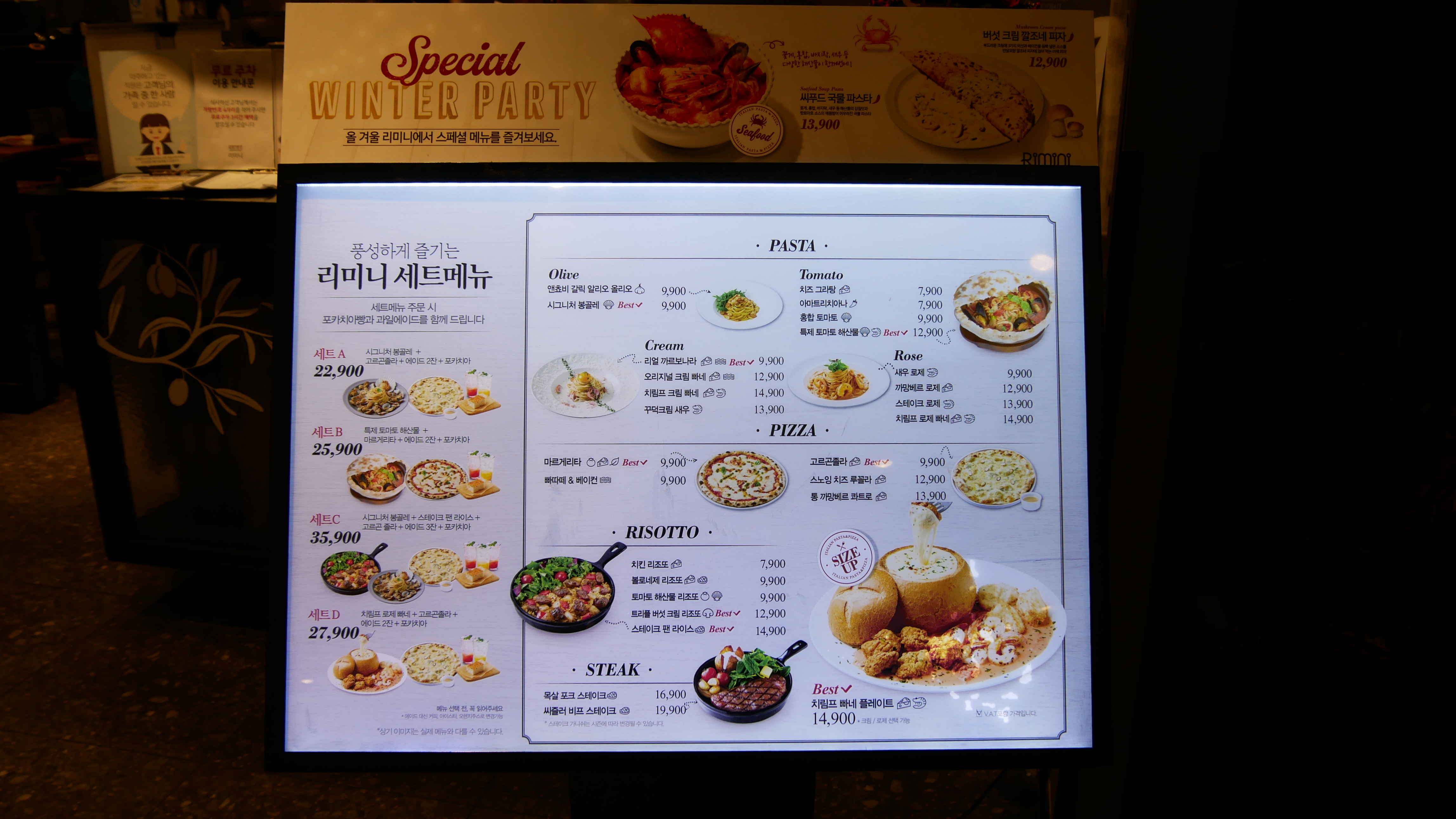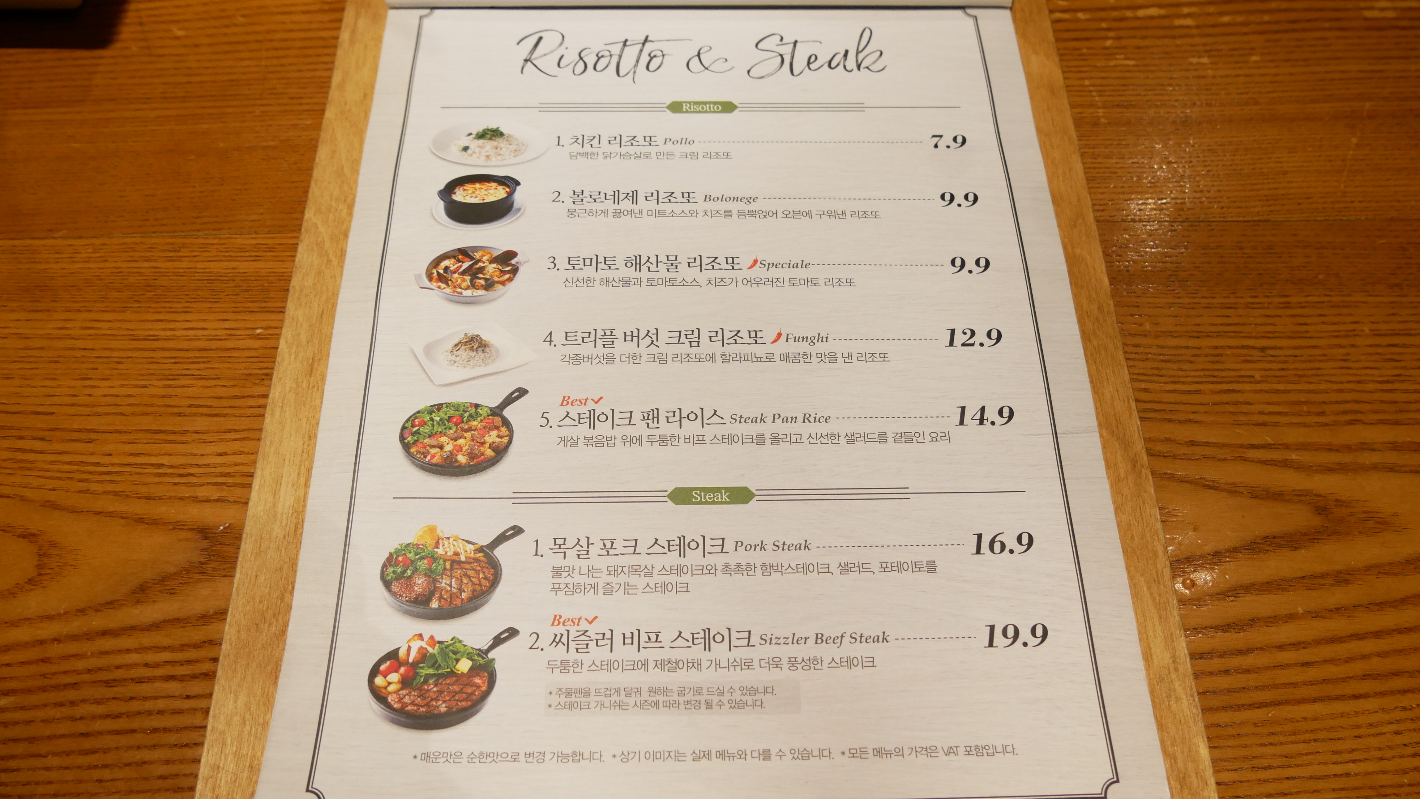 입구에는 이렇게 큰 메뉴판이 있는데요. 이곳 메뉴가 한눈에 들어오게 잘 정리가 되어 있어서 좋았습니다. 기본적으로 피자, 파스타, 리조또, 스테이크와 같은 메뉴가 있습니다. 이곳은 이탈리아 음식을 만드는 곳인지 방문해서 알았네요.