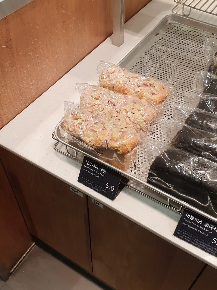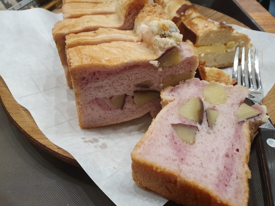 적고구마 식빵은 우리가 알고 있는 적색고구마를 이용해서 만든 식빵입니다. 안에 들어가 있는 내용물은 고구마인데요. 식감이 잘 익은 부드러운 밤이라는 느낌이 들었습니다. 너무 무르지 않고, 적당한 식감이 좋았습니다. 그리고 빵 위에은 소보로같은 느낌의 테두리가 있어서 고소한 맛을 더해줍니다. 하지만 개인적으로 5000원이라는 가격은 살짝 비싸다고 생각이 들었습니다. 맛은 좋았지만, 다른 식빵 전문점이랑 비교하면 크게 경쟁력이 없다는게 아쉬웠습니다. 물론 천연발효빵이라는 점은 높은 점수를 줄 수 있지만, 저는 천연발효빵이라는게 큰 매력이라고 생각하지 않기 때문에 ㅋㅋ.... 뭐 개인적인 기준이겠죠?