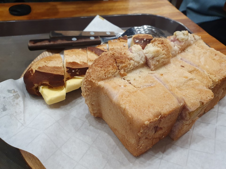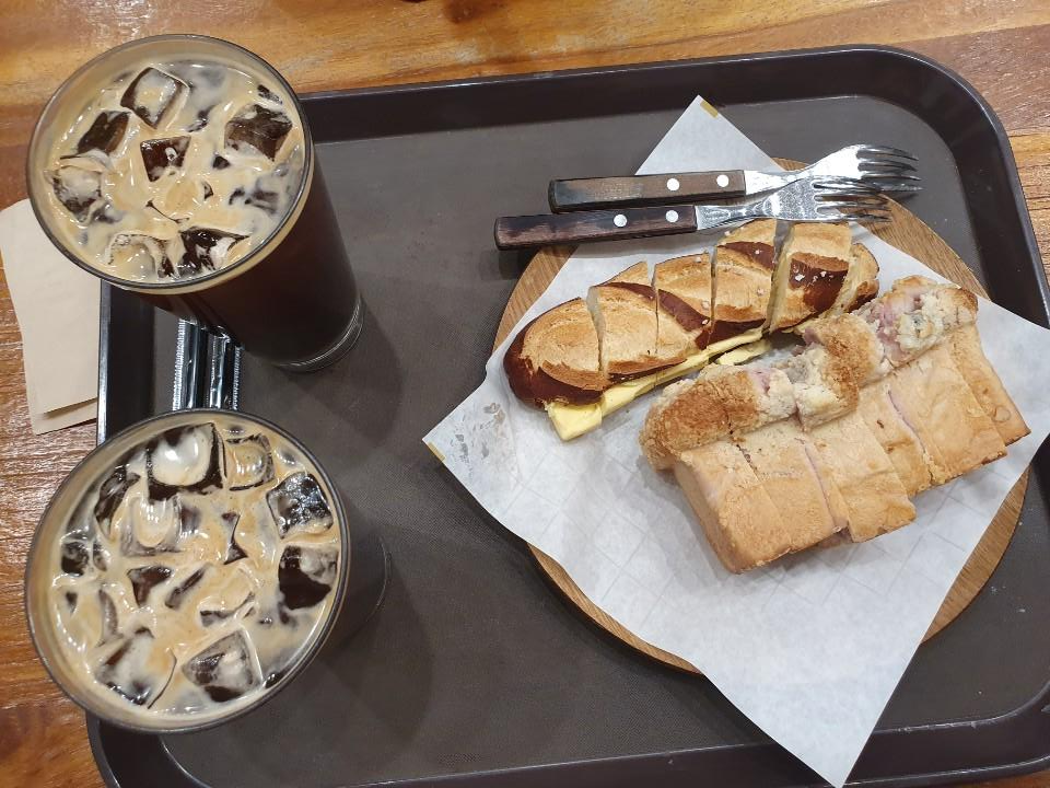 빵을 담아서 가져가면 이렇게 커피와 함께 빵이 컷팅되어 나오게 됩니다. 빵은 따뜻하게 살짝 데워서 나오더라고요. 이 부분은 꽤 좋았습니다. 식빵같은 경우에는 따뜻하게 먹으면 더 맛있긴하죠.
