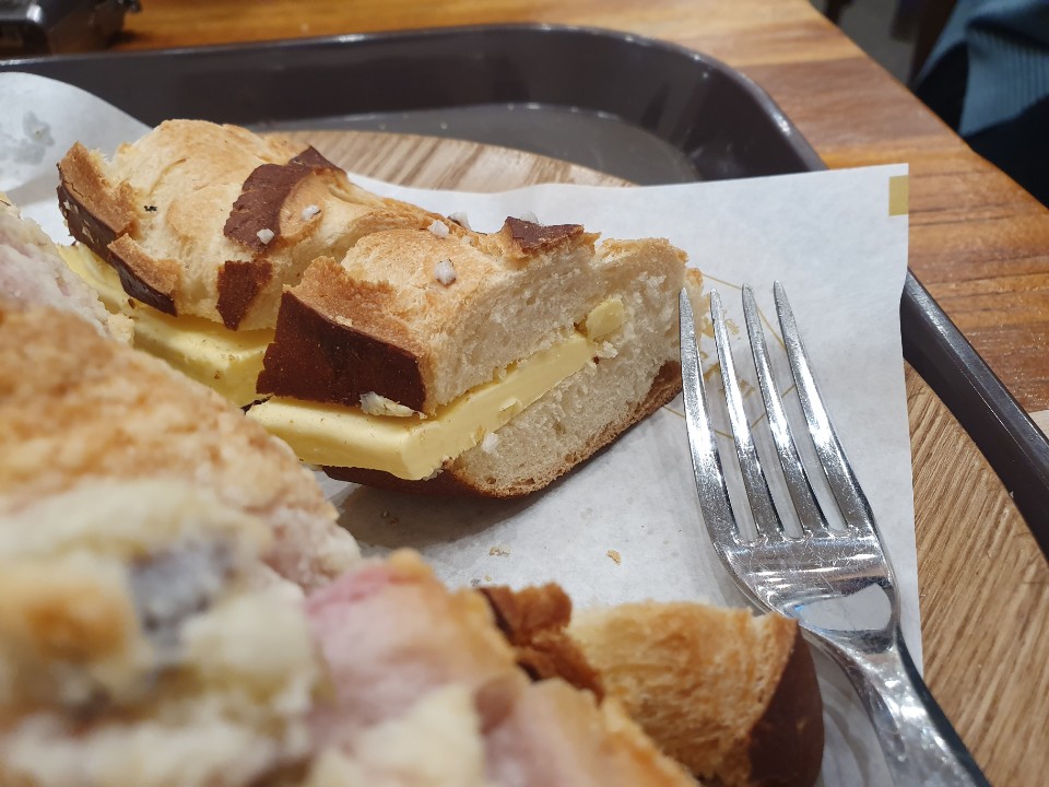 짤린 빵의 단면은 이렇게 생겼는데요. 저는 개인적으로 버터 프레첼에 큰 기대를 하지 않았습니다. 일반적인 프레첼은 너무 짠맛이 강해서 안땡기거든요. ㅋㅋ 그런데 이곳은 정말 달랐습니다. 나중에는 이것만 먹을 정도로 맛있었습니다.