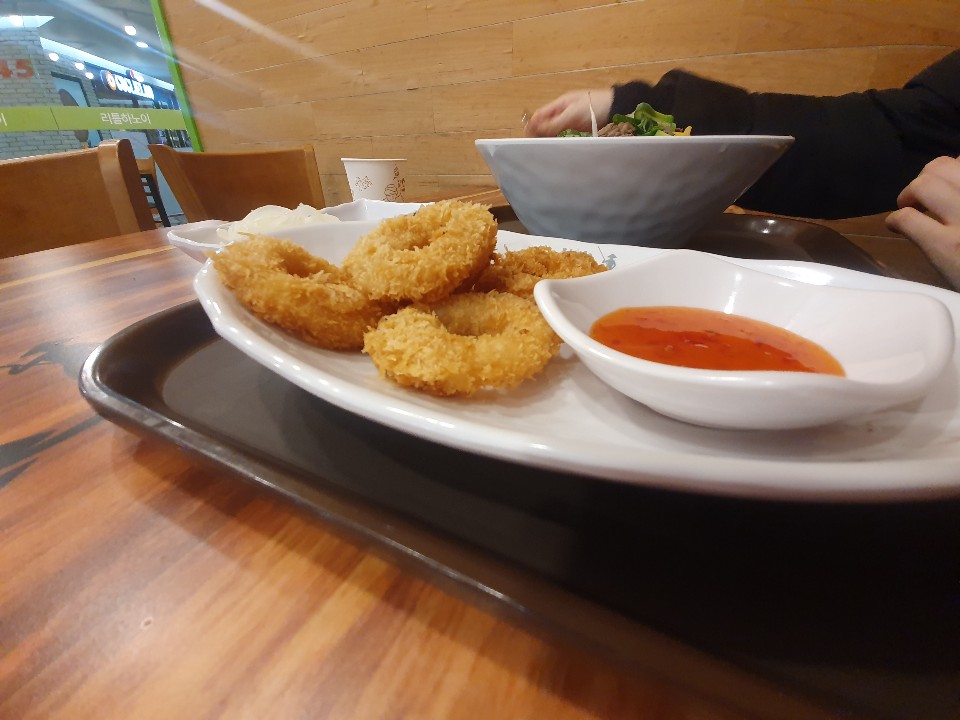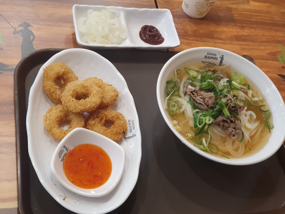 저는 이미 점심을 먹은 상태이기 때문에 여자친구만 주문을 하였습니다. 양지쌀국수와 새우링튀김 세트메뉴를 주문했습니다. 가격이 9800원인가 그랬던 것으로 기억하는데요. 세트메뉴치고 그렇게 비싼 가격은 아닌것 같네요. 양지쌀국수는 일반 사이즈가 6400원이고, 곱배기는 6900원으로 나름 괜찮은 가격이라고 생각되더라고요. 요즘 쌀국수를 안먹긴 했는데, 조금 뺏어 먹어보니... 맛있긴 하더라고요. ㅋㅋ