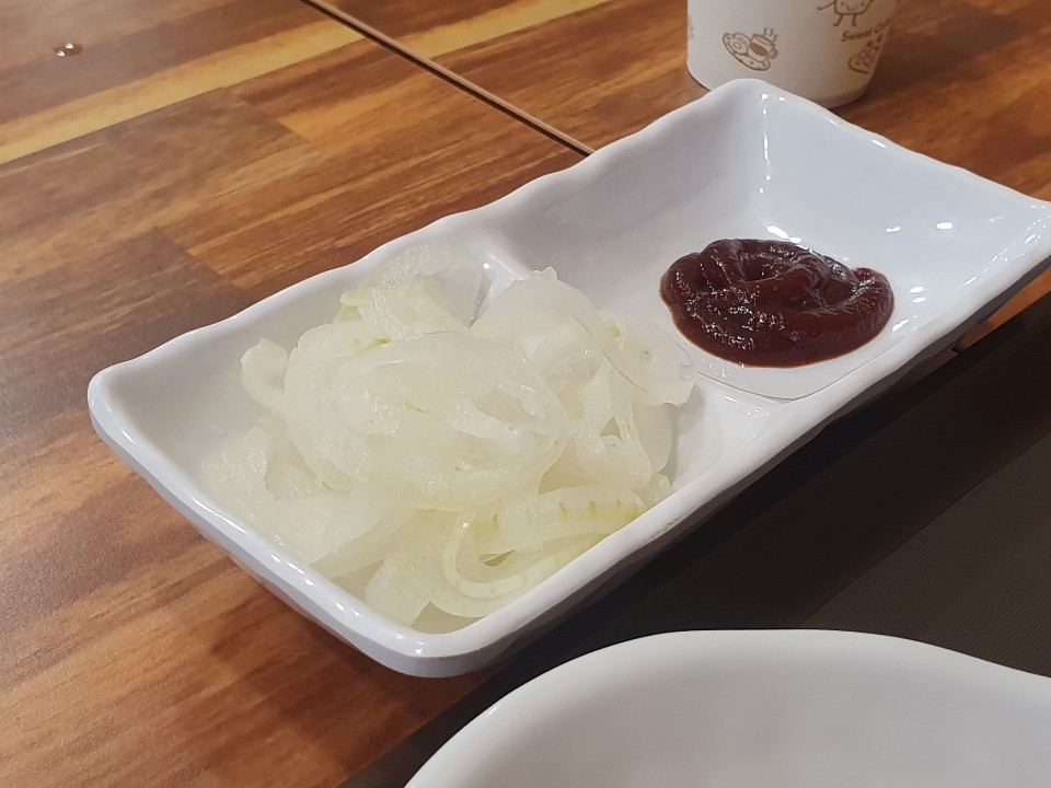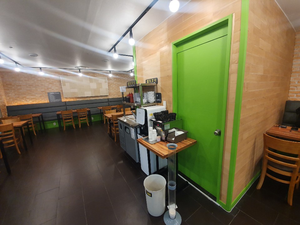 매장 가운데에는 셀프코너가 있습니다. 숟가락, 젓가락, 냅킨, 물컵, 양파, 소스 등 음식을 제외한 모든것은 셀프코너에서 가져올 수 있습니다. 그리고 음식은 키오스크를 이용해서 주문을 하게되고, 주문한 음식은 직접 가져다가 먹으면 됩니다. 거의 요리를 제외하곤 나머지는 셀프라고 보시면 됩니다. 그리고 다 먹은 음식은 퇴식구로 가져가시면 됩니다.