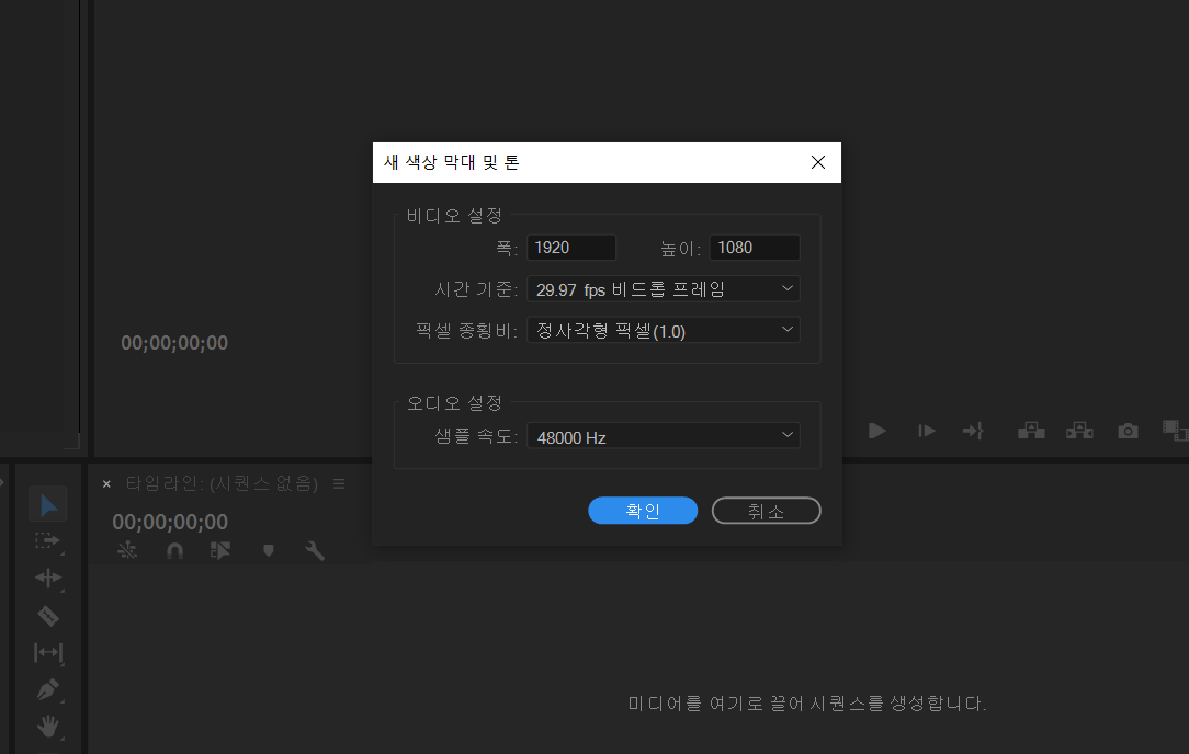 이런식으로 창이 뜨고 여기서 폭이랑 높이, 프레임을 설정할 수 있습니다. 그리고 오디오도 설정할 수 있는데요. 특별히 원하는게 없다면 그냥 폭과 높이만 맞추고 확인을 누르시면 자동으로 생성되는 것을 볼 수 있습니다.