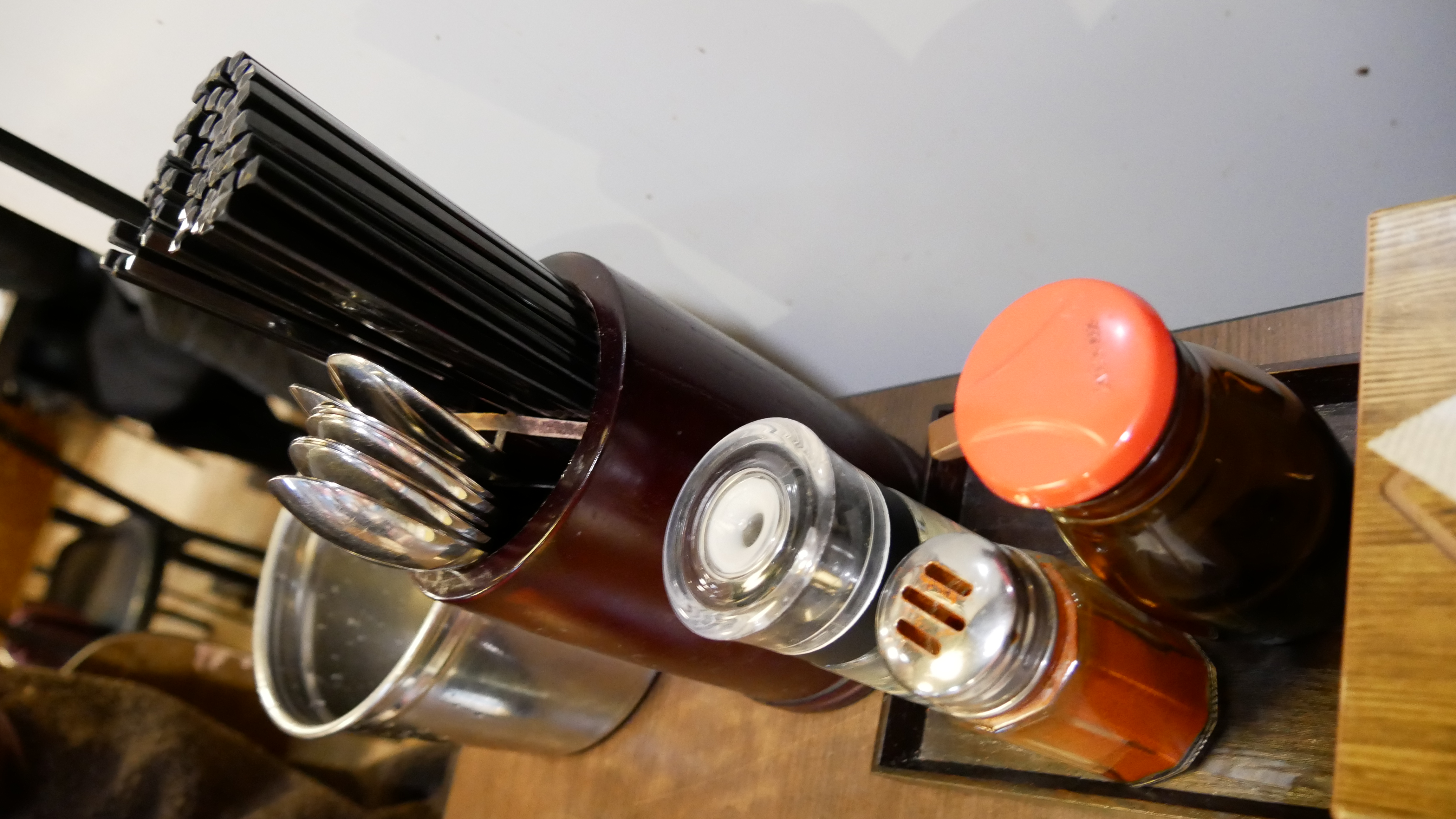 테이블마다 젓가락과 숟가락이 있고, 간장, 고추가루, 식초가 있습니다. 그리고 테이블마다 메뉴판이 있습니다.