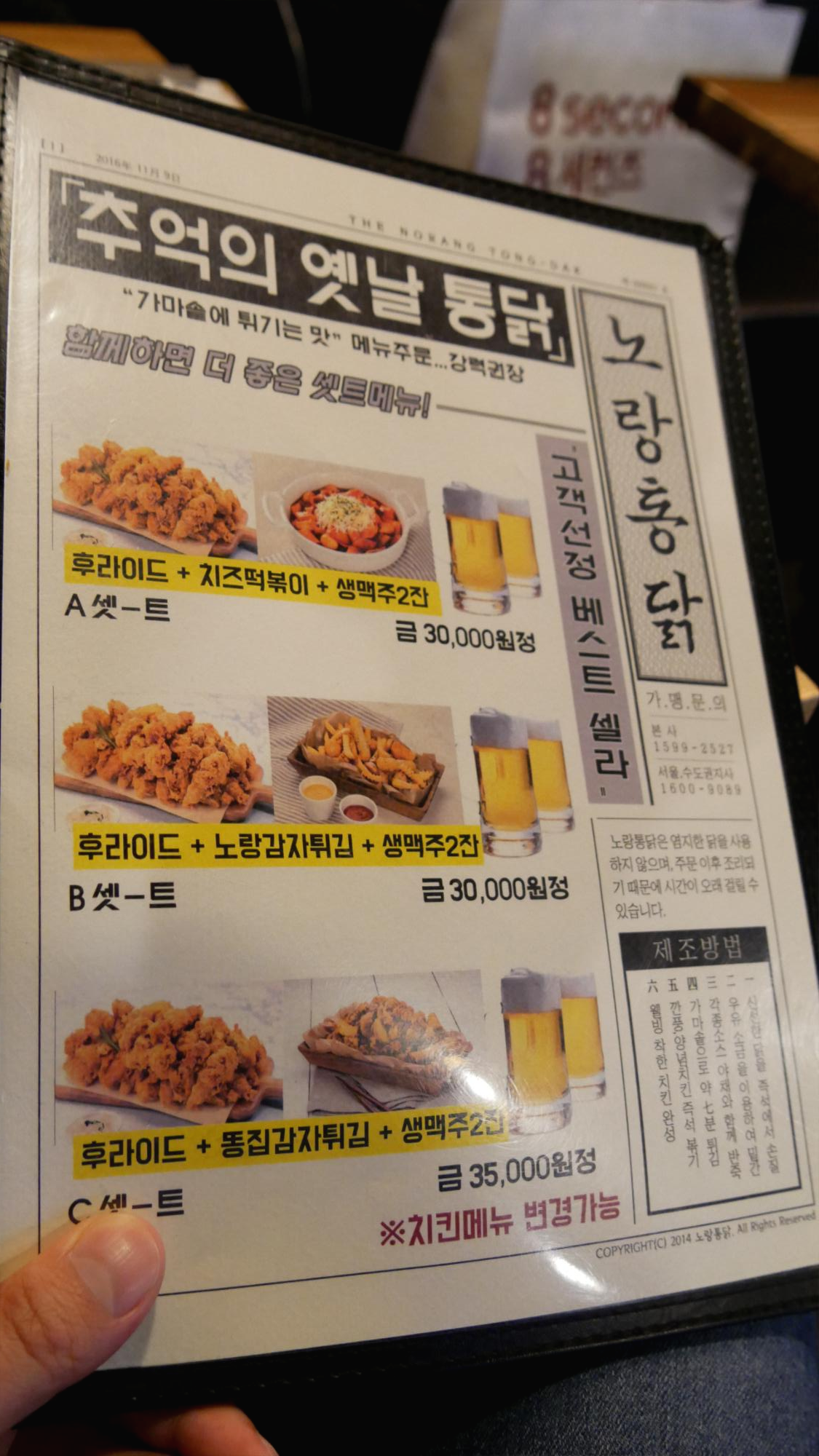 그리고 이곳에서 가장 많이 나가는 대표메뉴인 엄청 큰 후라이드 치킨과 순살 3종세트가 있습니다. 엄청 큰 후라이드 치킨은 뼈와 순살중에서 선택할 수 있고, 가격은 17000원입니다. 이 메뉴를 주문한다면 뼈를 주문할 것 같네요. 왜냐면 그 아래 순살 3종 세트가 있기 때문인데요. 가격도 2000원밖에 차이가 나지 않고, 3가지 맛을 다양하게 즐길 수 있기 때문이죠. 저는 순살파이고 여자친구는 뼈파인데, 이날은 순살을 먹기로 했습니다. 그래서 순살 3종세트와 맥주 500과 사이다를 주문했습니다.