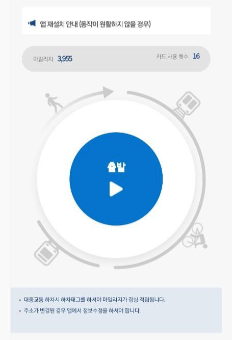 해당 어플을 이용하기 위해서는 GPS와 데이터가 켜져 있어야합니다. 실제로 이동한 거리 (걸어간 거리 + 대중교통을 이용한 거리)을 이용해서 적립금이 결정되는 시스템이더라고요.