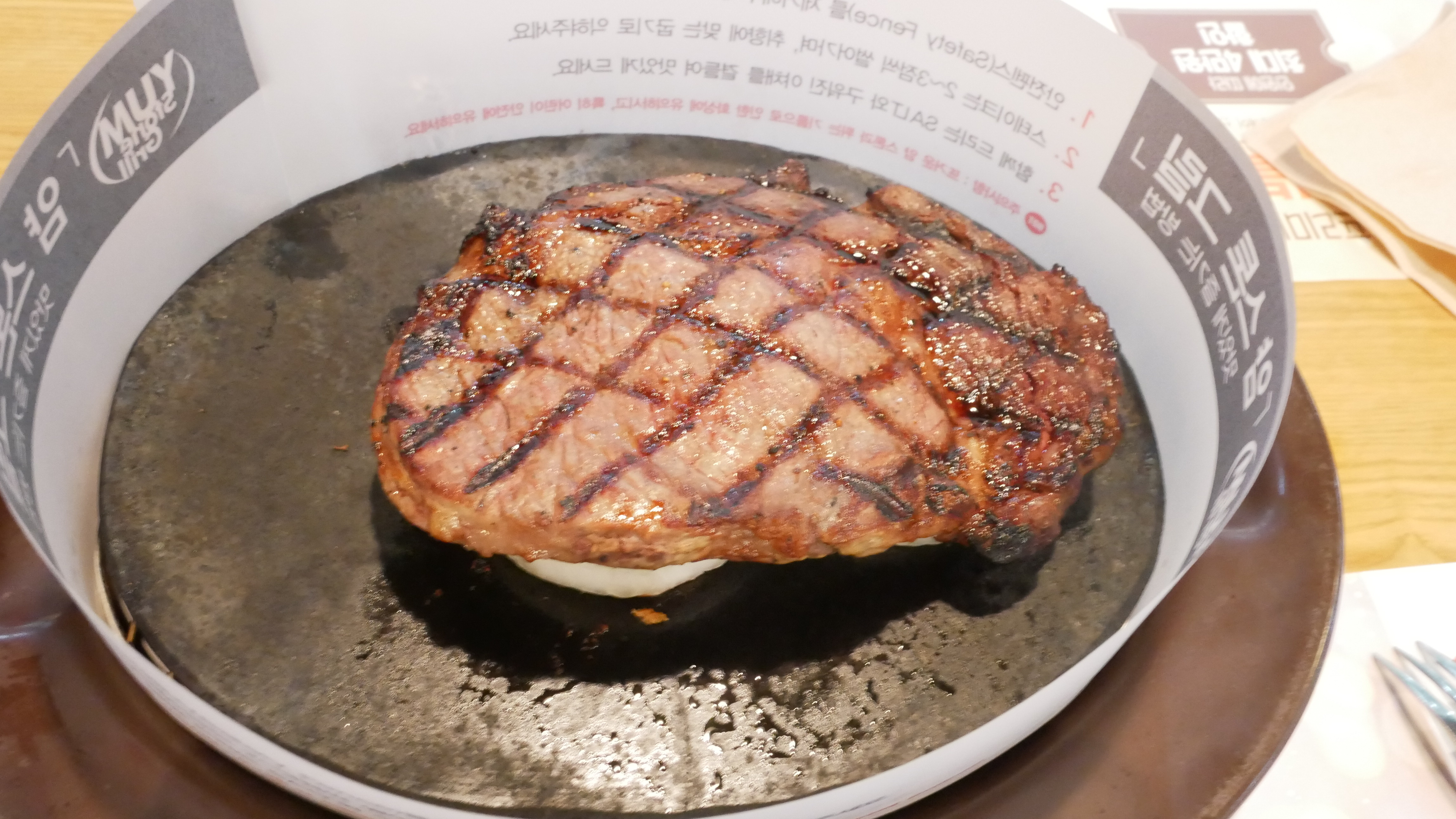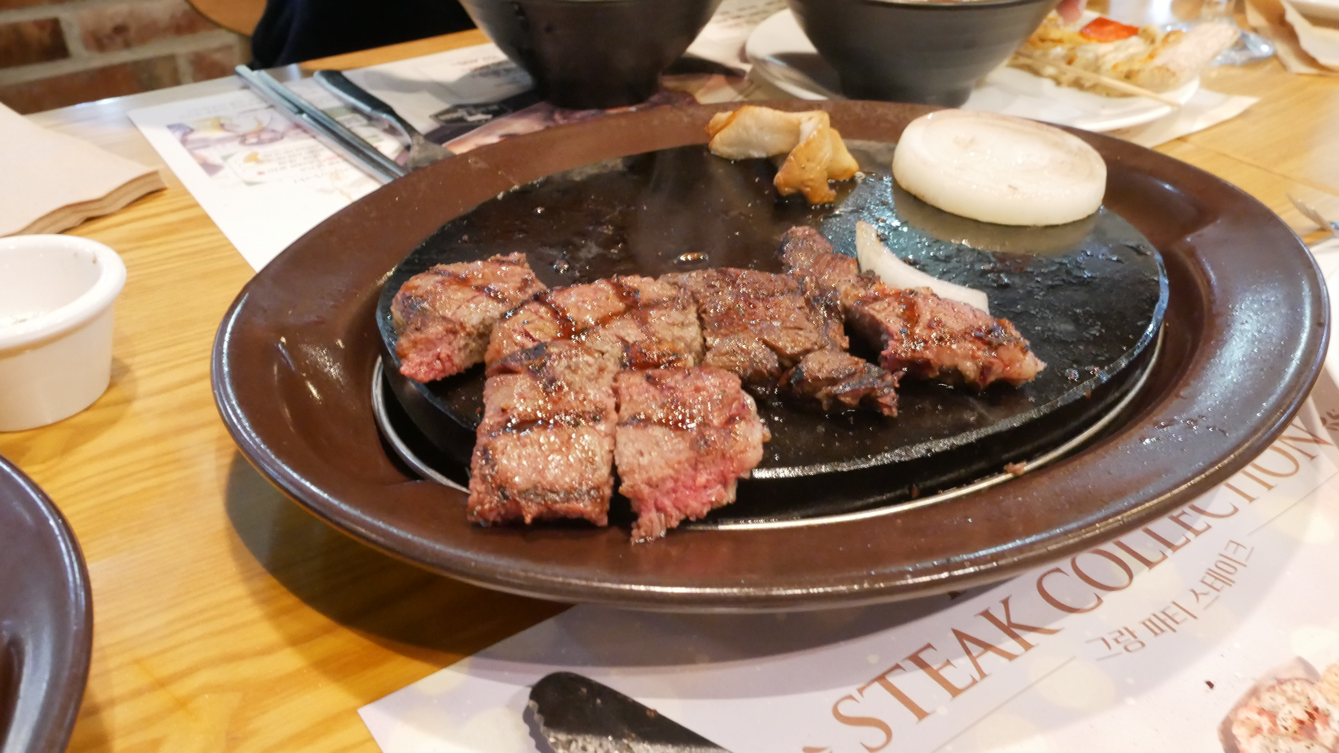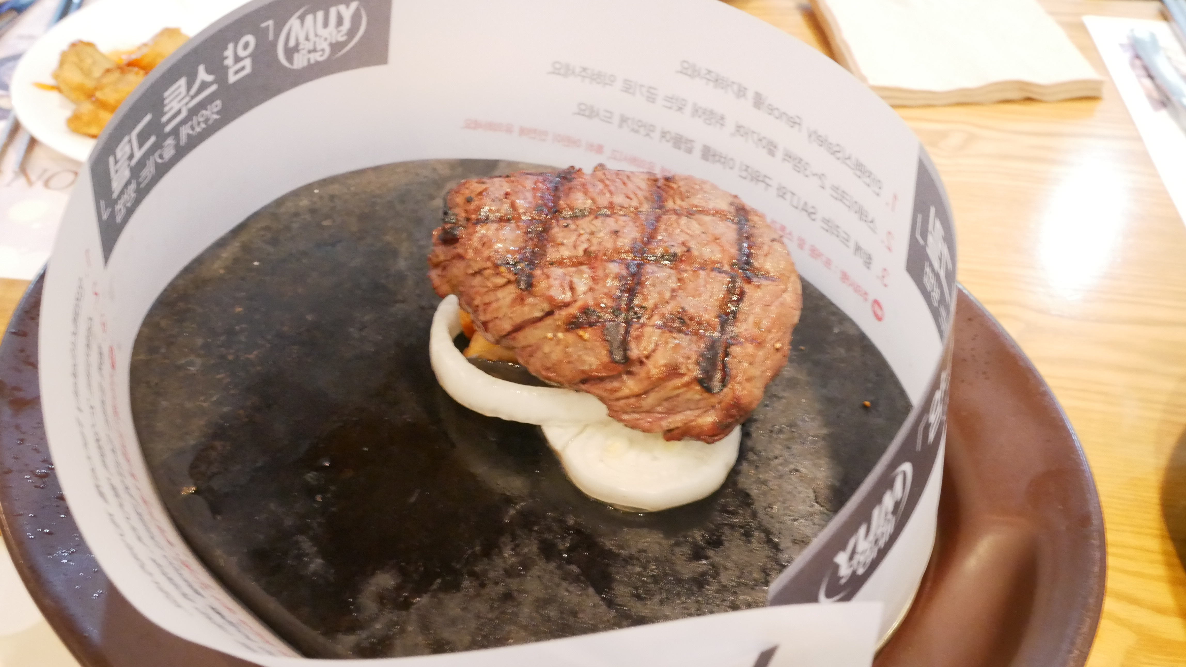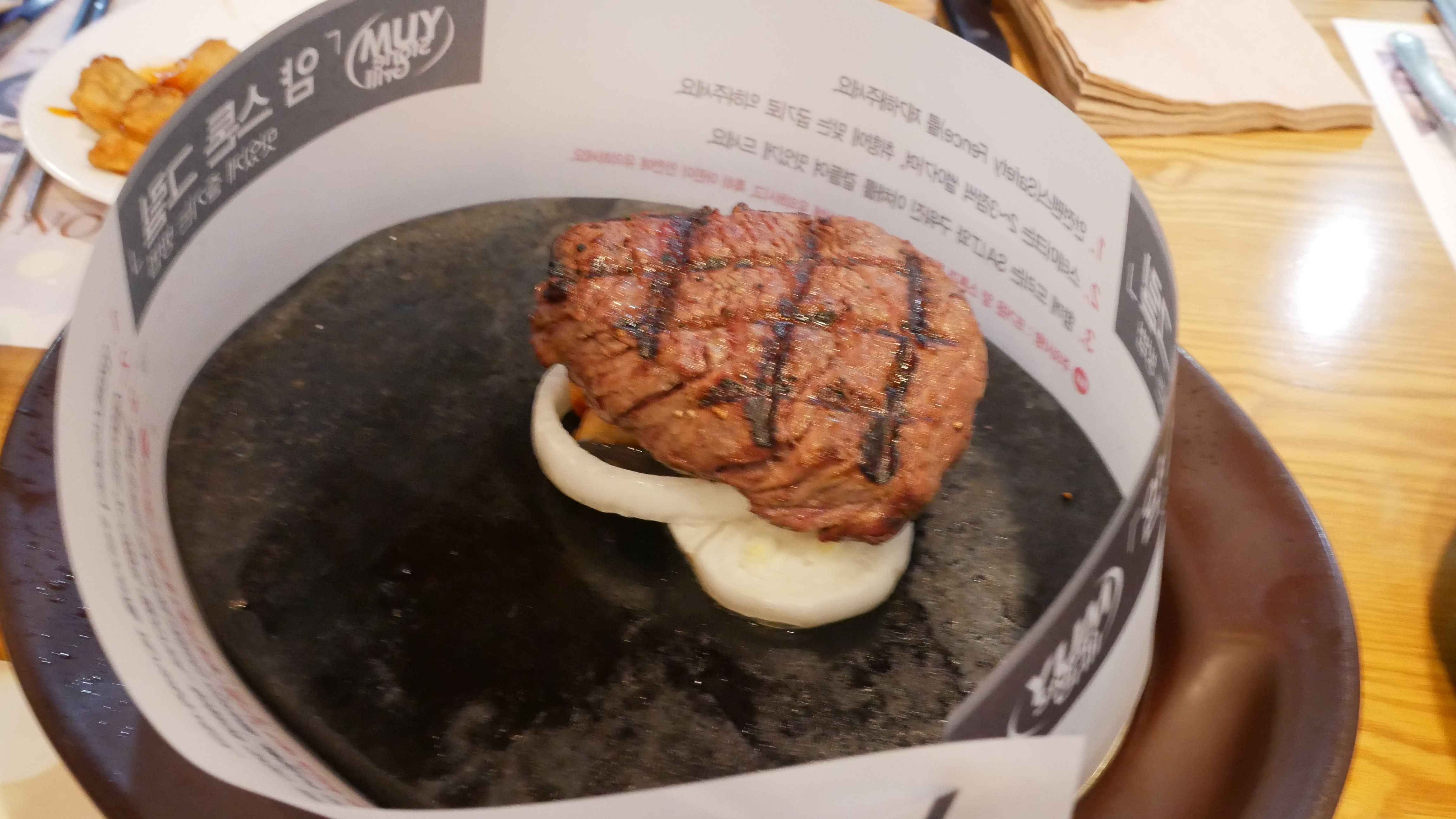 이건 등심스테이크입니다. 밑에는 양파와 버섯 마늘이 있습니다. 그리고 스톤그릴이 있기 때문에 굽기를 조절할 수 있습니다.