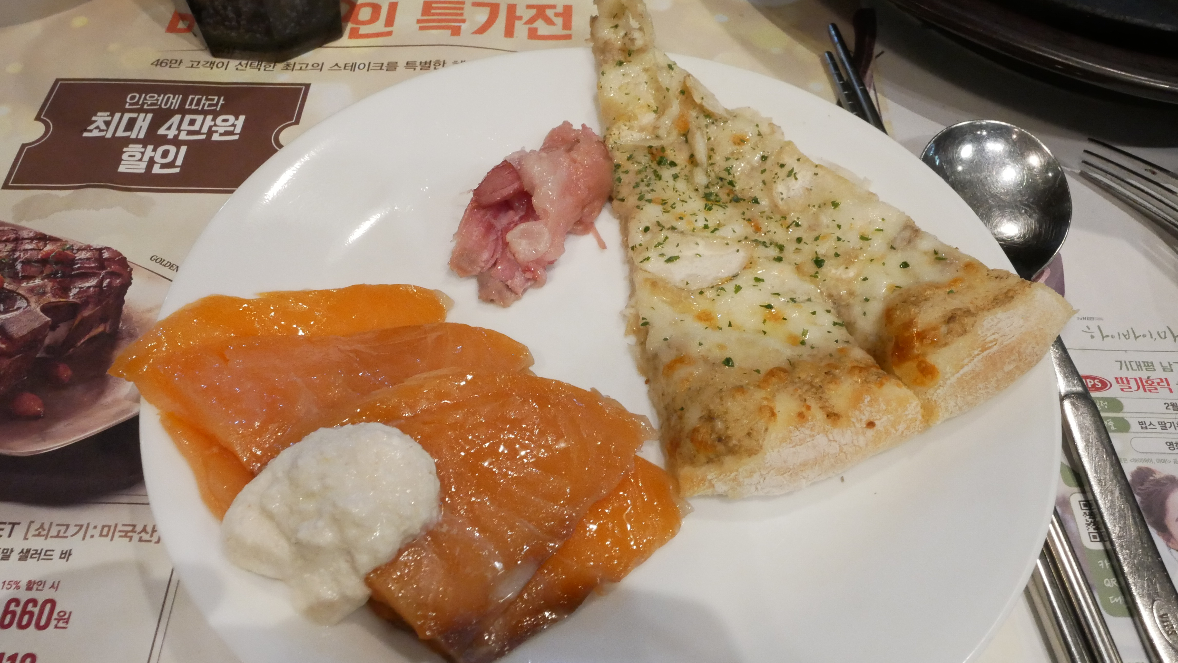 테이블에는 지금 행사중인 메뉴들이 있는데요. 저희는 샐러드바 4인과 안심, 등심 스테이크를 주문했습니다.