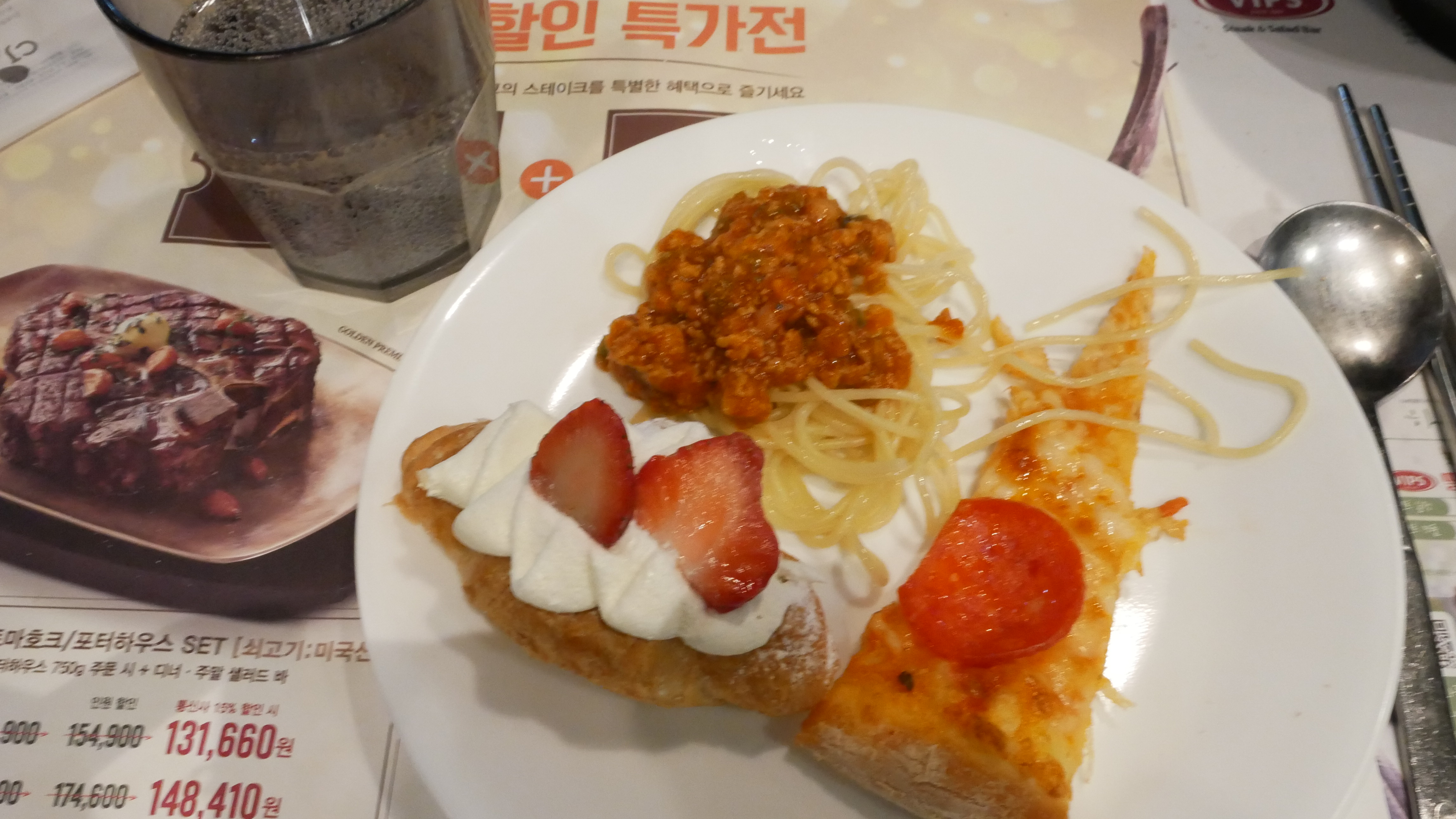 스파게티는 꽤 맛있었습니다. 크로와상도 맛있었습니다. 피자도 맛있었고요. ㅋㅋ 하지만 딸기가 그렇게 신선한다는 느낌을 받지 못했습니다.