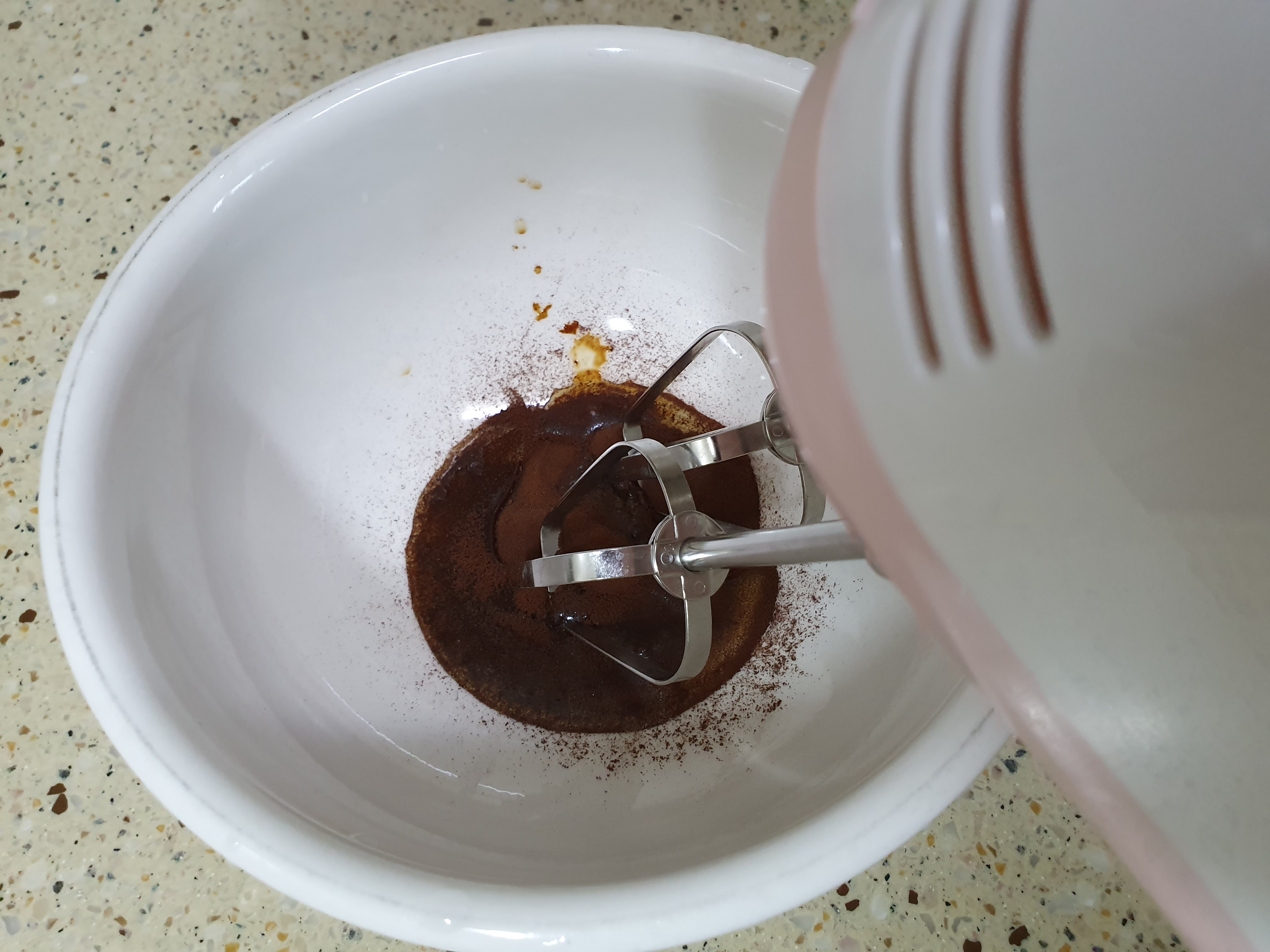 저는 집에 거품기가 있기 때문에 거품기를 사용했습니다. 머랭만들때와 비슷하게 쫀득쫀득할때까지 거품기를 돌려주면 됩니다. 물론 손으로 만들어도 괜찮지만, 커피하나 먹으려면 손이 ㄷㄷ...