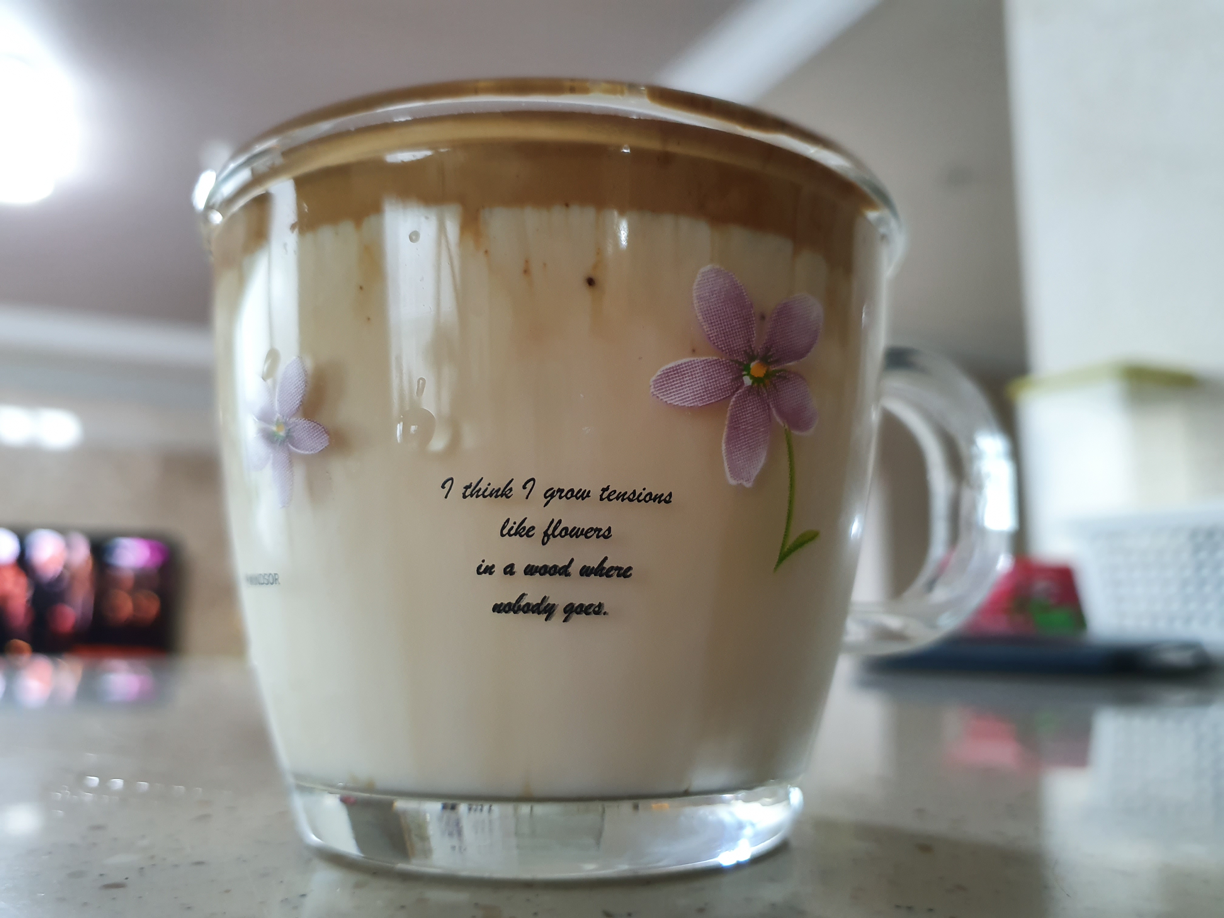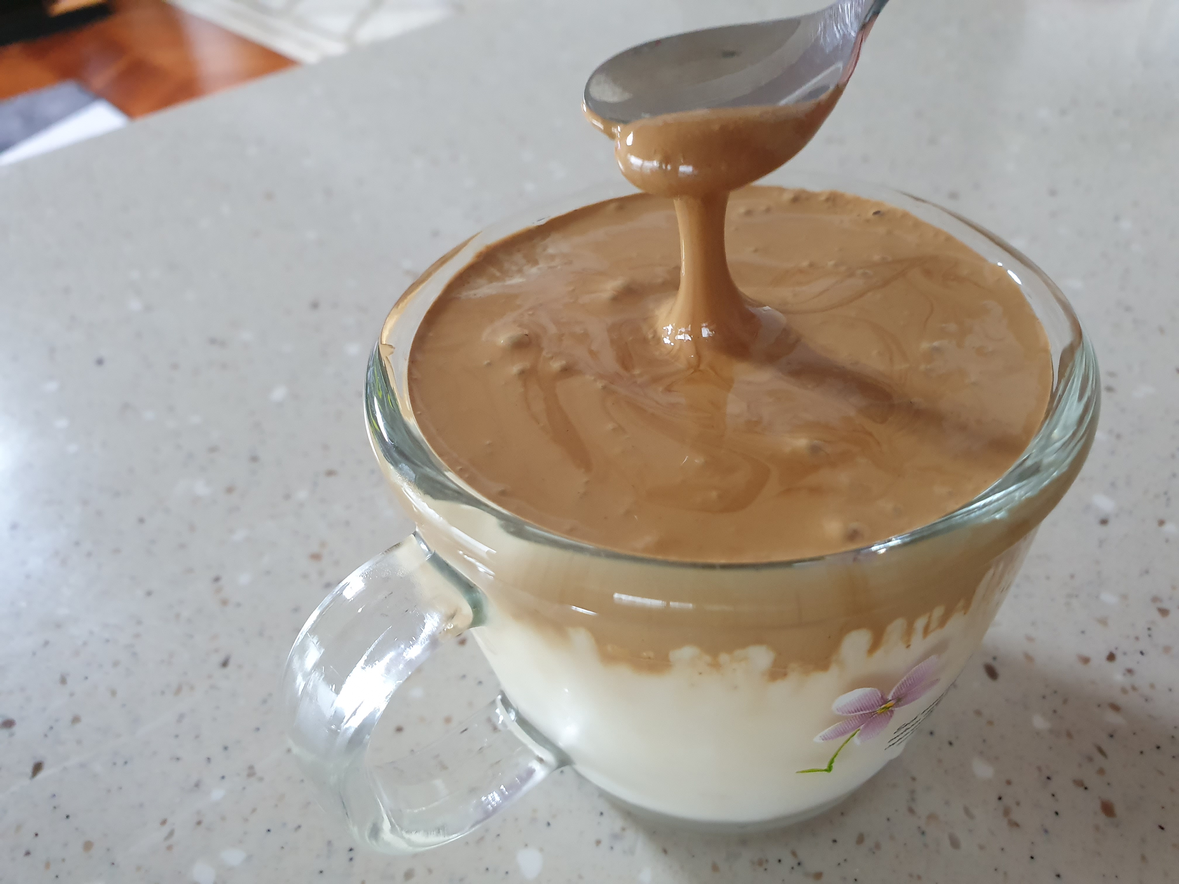 달고나 거품이 완성이 되면 잔에 우유를 따르고 그 위에 달고나 거품을 살짝 올려줍니다.