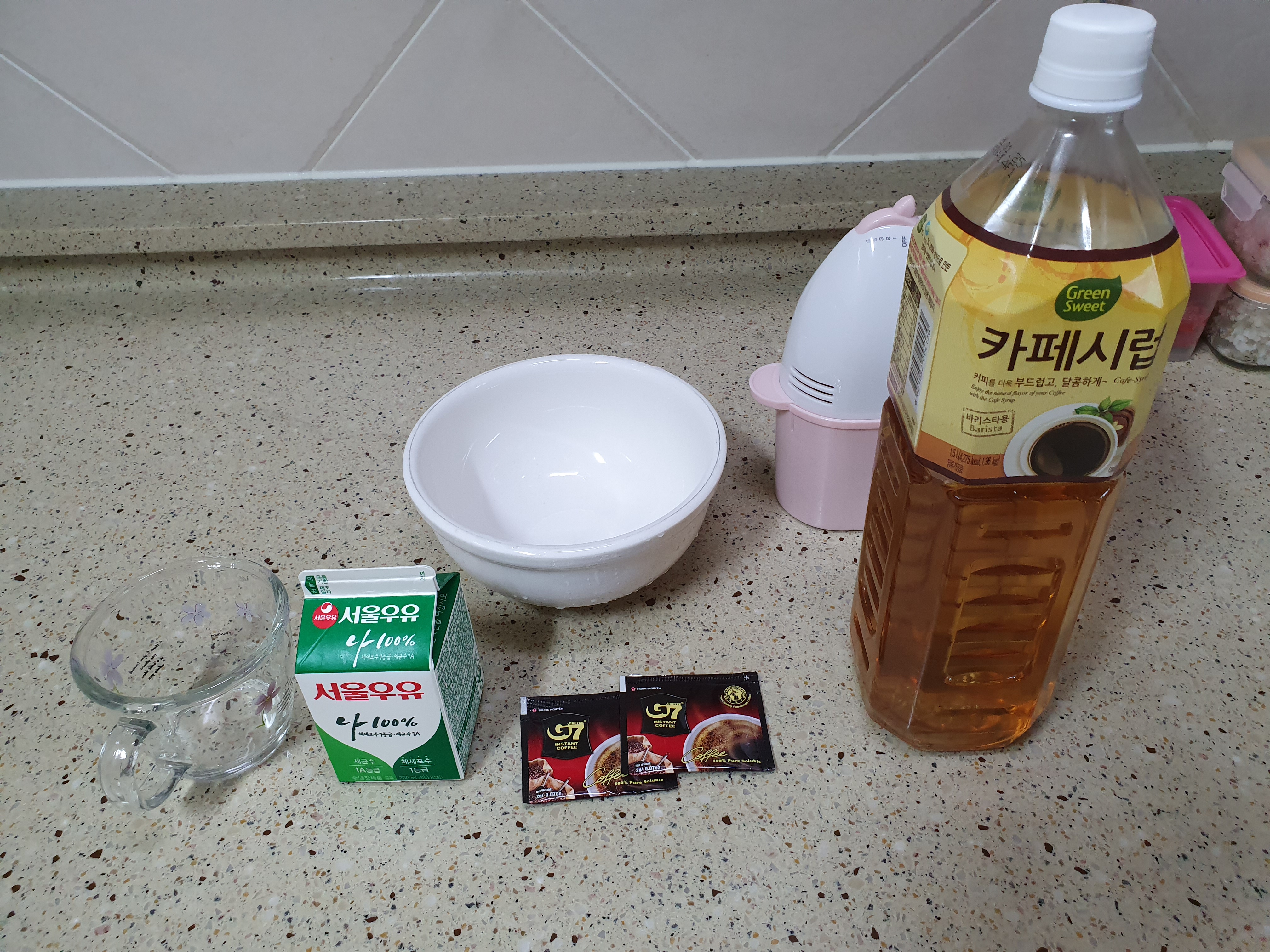 라떼를 만들기 위해서 우유가 필요하고요. 인스턴트 가루 커피와 카페시럽이 있습니다. 대부분 인터넷 레시피를 보면 설탕과 뜨거운물을 이용해서 만들지만, 저는 카페시럽을 이용했습니다.
