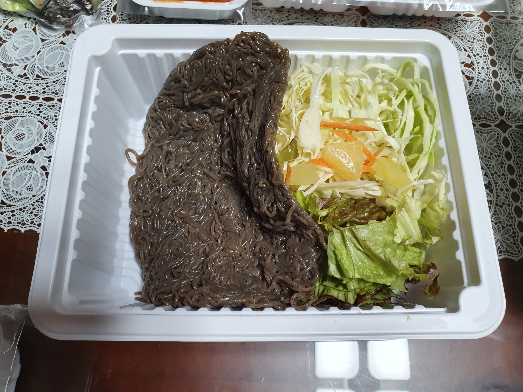 구성은 족발, 막국수, 야채, 김치 2종류, 그리고 어리굴젓이 있는데요. 그리고 사진에는 없지만 사이다도 있습니다. 가격에 비해서 나쁘지 않은 구성이라고 생각합니다.