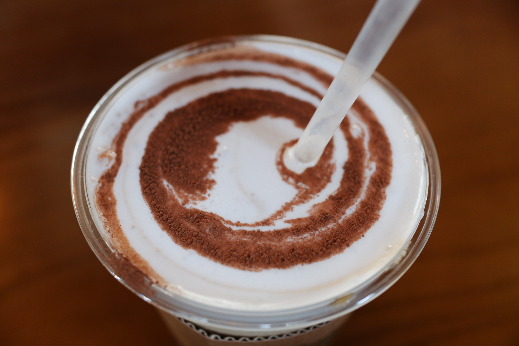 크림플랫화이트는 우유와 샷 크림이 층을 이루고 있는데요. 위에는 코코아 파우더가 올라가 있습니다.