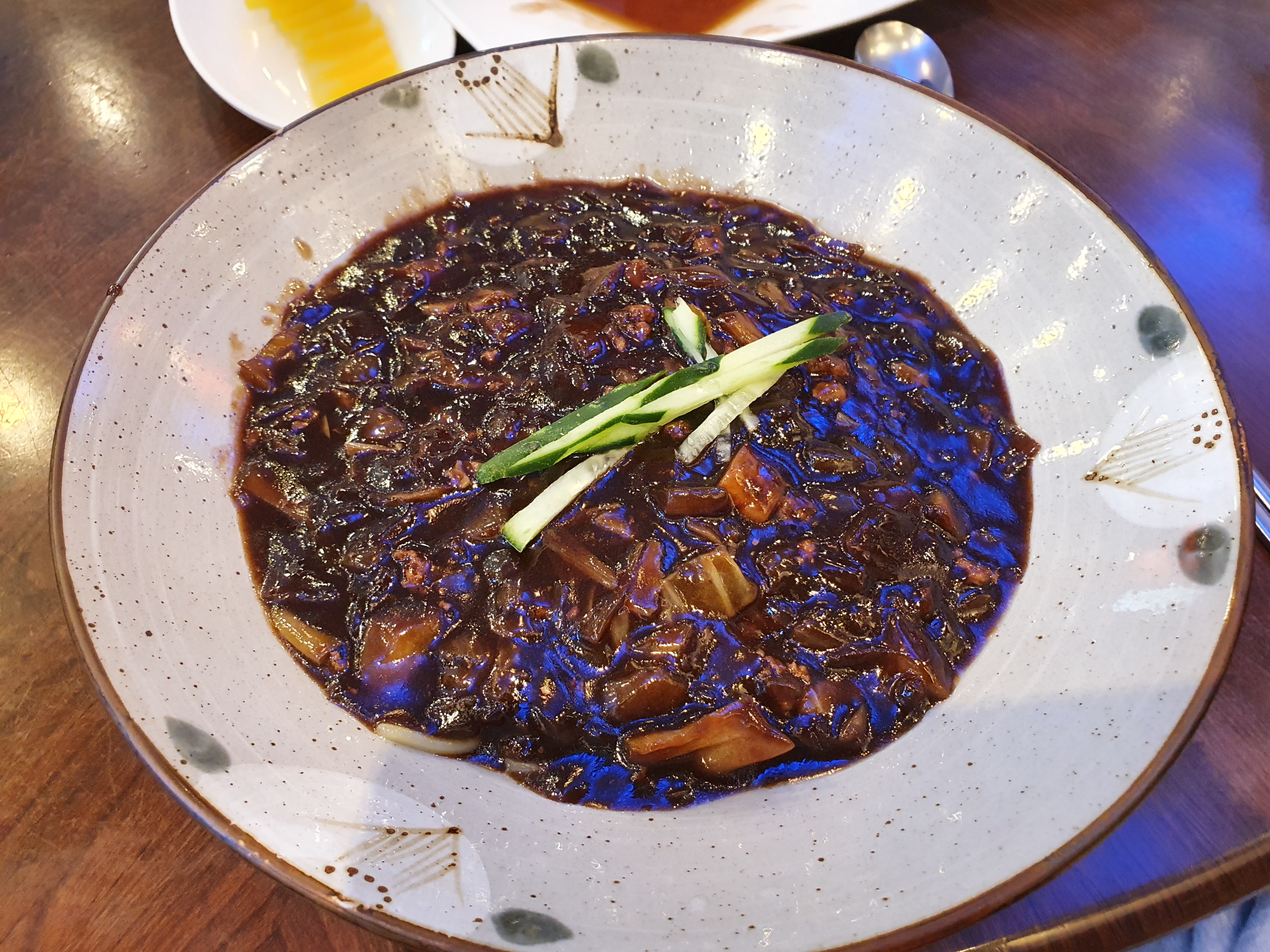 마지막으로 짜장면인데요. 여기서 가장 저렴한 가격입니다. 심플하게 딱 오이가 올라간 짜장면인데요. 옛날 짜장면은 아니고 요즘 짜장면 맛입니다. 기름지고 짭짤하면서 계속 끌리는 맛입니다. 사실 짜장면이 정말 맛을 표현하기 어려운데요. 그만큼 기본적이지만 어려운 음식이라고 생각합니다.