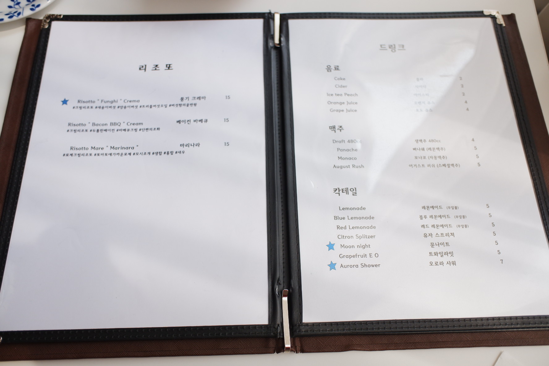 하지만 저희는 한시간동안 밖에서 기다리면서 이미 메뉴는 다 정했기 때문에 바로 주문을 했습니다. 풍기 크레마와 알리오 올리오를 주문했는데요. 가격은 각각 15000원, 12000원이였습니다.