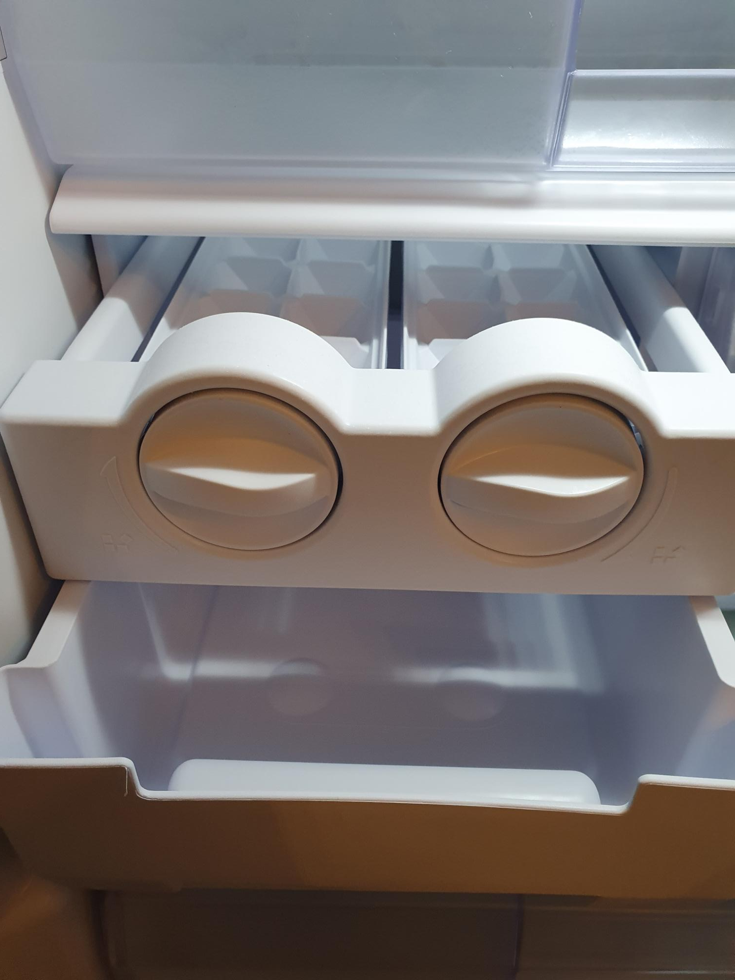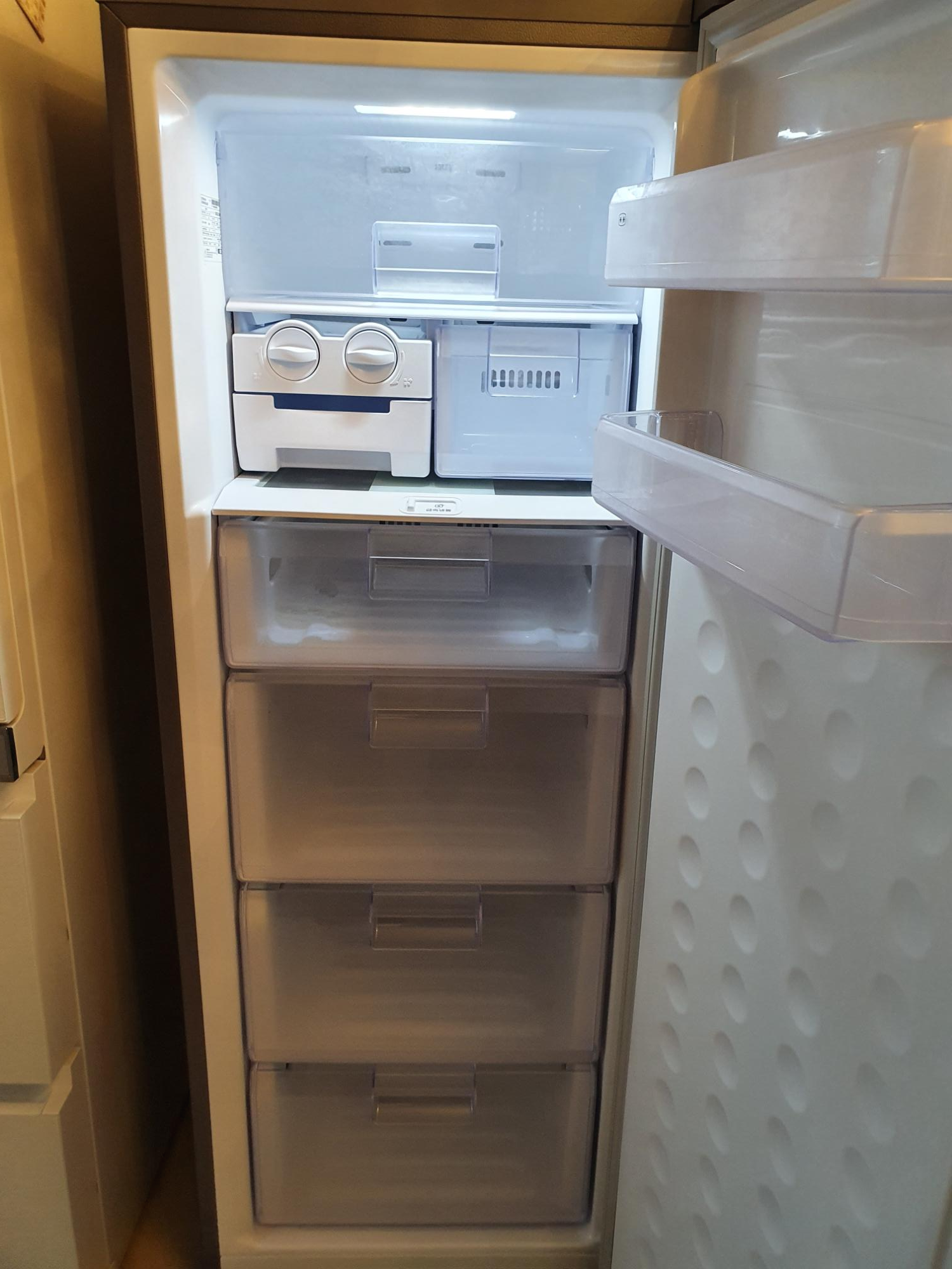 내부는 이렇게 생겼고요. 아래 큰 통이 3칸이 있고, 그 위에 작은 칸이 있습니다. 그리고 상단에는 얼음을 관리할 수 있는 틀과 아이스크림처럼 자주 꺼내 먹을 수 있는 것들을 넣을 수 있는 통이 있습니다. 그리고 가장 위에는 가벼운 재료를 넣을 수 있는 통도 있어요. 그리고 문에는 2개의 스탠드가 있는데요. 이곳에도 간단하게 먹을 수 있는 것들을 놓을 수 있습니다.