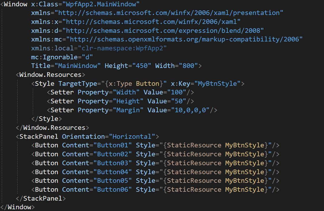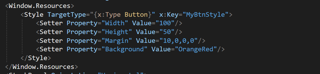 이런식으로 코드를 수정할 수 있습니다. 스타일을 만들기 위해서는 스타일이 사용될 위치보다 상위의 태그에서 Resources를 정의해주는 것인데요. 물론 ResourceDictionary에 등록하여 Style을 사용하는 방법도 있지만, 이번에는 해당 xaml에서 등록해서 사용하는 방법으로 이야기를 진행하겠습니다. 해당 내용은 다른 포스팅에서 다루도록 하겠습니다.