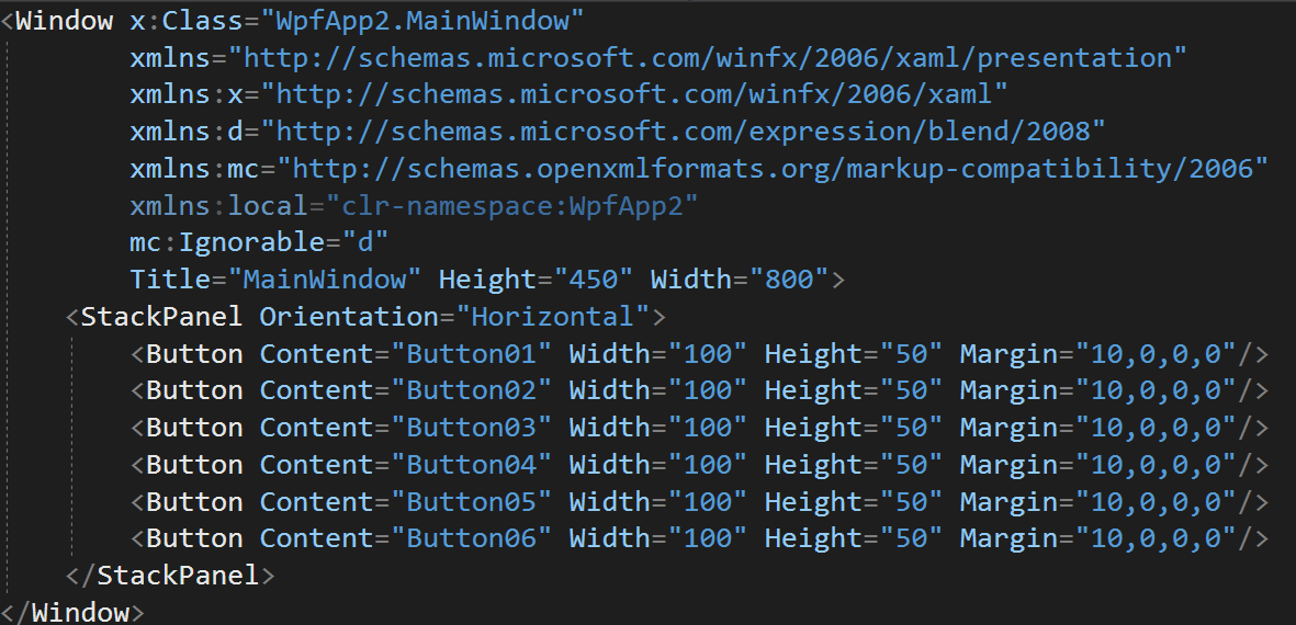 이런 코드가 있다고 해볼께요. StackPanel에 버튼을 여러개를 만들어야하는 경우인데요. 코드를 보시면 Width, Height, Margin 이라는 3가지 속성이 전부 동일한 것을 보실 수 있습니다. 이런 경우 코드를 작성하고 유지관리하는데 버튼를 하나하나 수정해야하기 때문에 엄청난 비효율이 발생하게 됩니다.