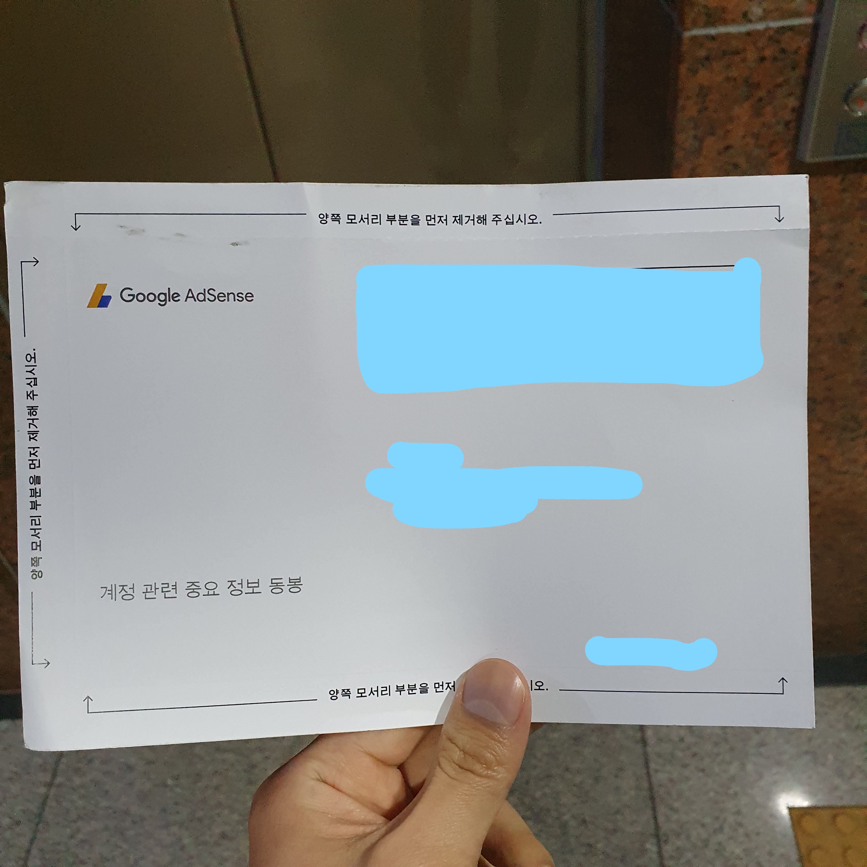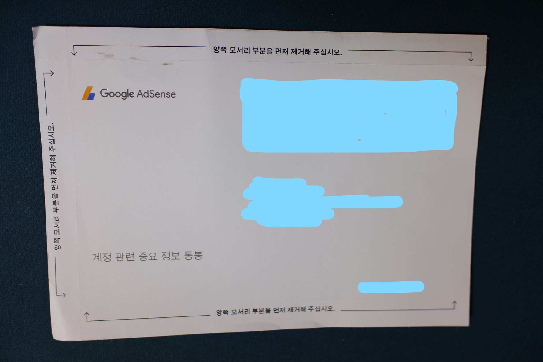 드디어 오늘! 우편이 도착했습니다. 일반 우편물이랑 생긴게 많이 달라서 왠 전단지야 하고 꺼냈는데 ㅋㅋ 애드센스 마크가 눈에 딱 보이더라고요. 너무 좋았습니다. 얼마 없는 수익이지만 ㅋㅋㅋㅋㅋ