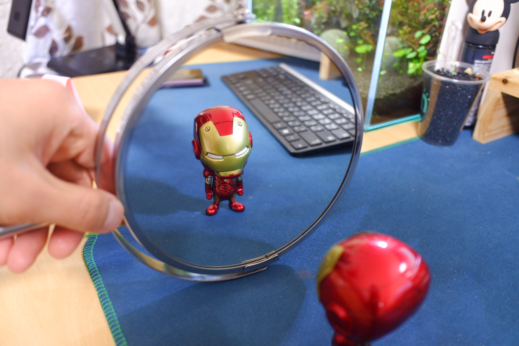 같은 위치에서 찍은 사진인데요. 왼쪽이 일반 거울 오른쪽이 확대경입니다. 위에서 찍은 사진이예요. 약간 대각선 위?