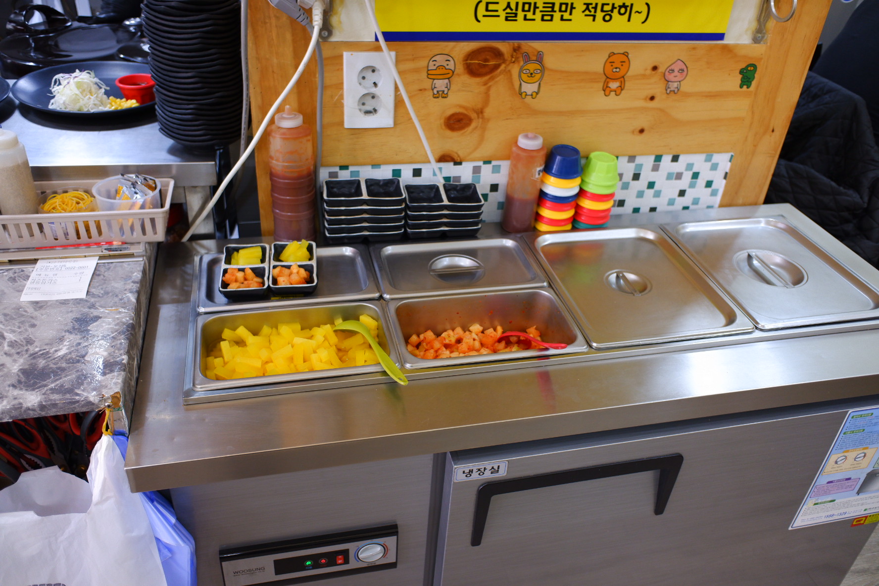 한쪽에는 셀프바가 있습니다. 반찬은 단무지와 김치 2개가 있습니다.