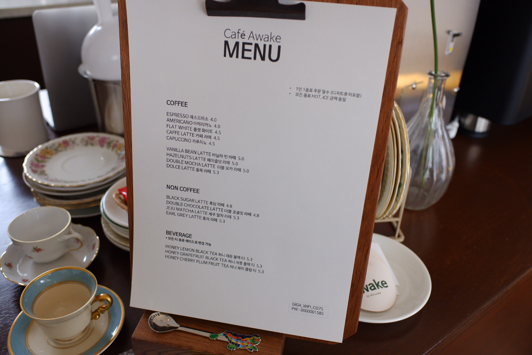 메뉴는 Coffee, Non Coffee, Reverage가 있습니다. 저희는 플랫화이트와 바닐라 빈 라떼 아이스를 주문했습니다. 가격이 4500원 5000원이였습니다. 그리고 말차 화이트 초코 쿠기도 주문했습니다. 가격은 3500원입니다.