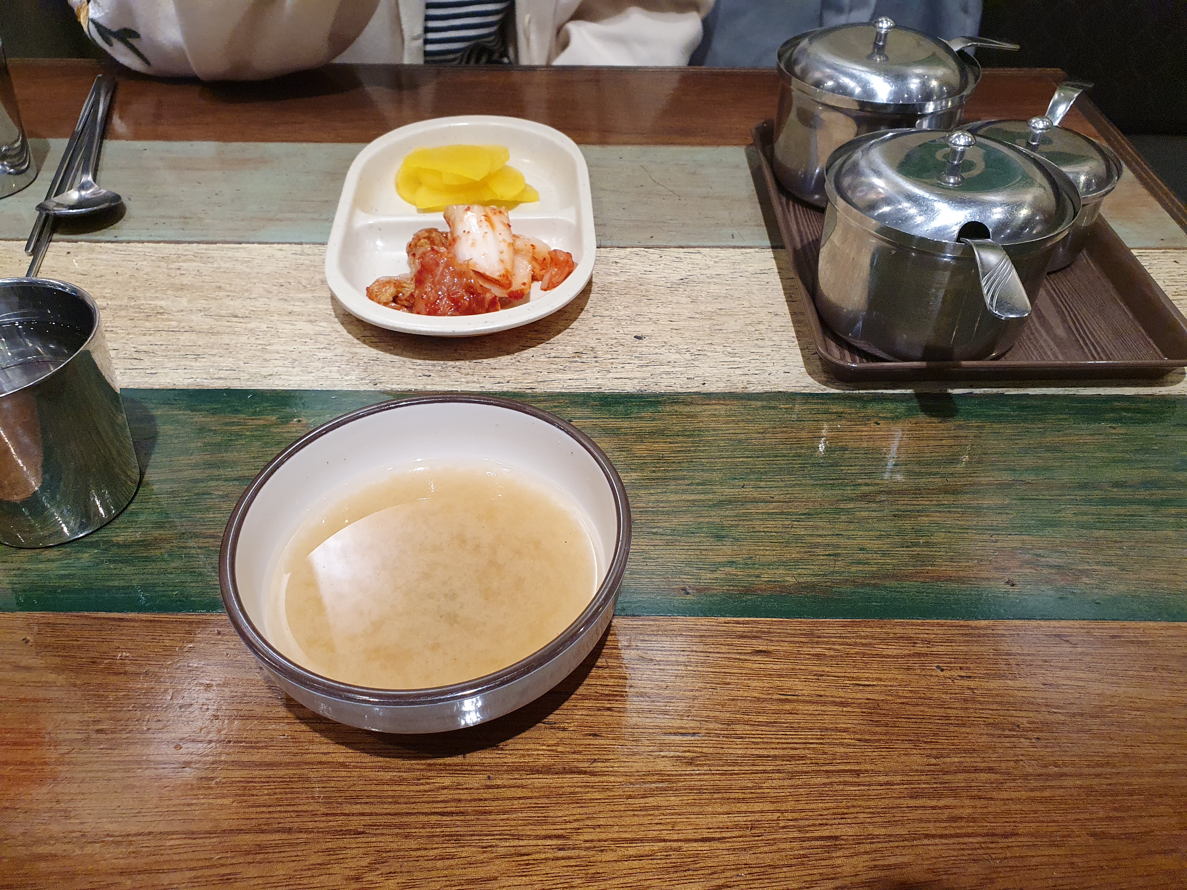 주문을 하니까, 기본반찬으로 김치와 단무지를 가져다 주셨습니다 그리고 맑은 된장국도 나왔는데요. 이건 김밥을 주문해서 나온 것 같았어요. 특별한 것은 없지만, 따뜻하고 구수해서 좋았습니다. 그리고 오른쪽에 양념통 3개는 판모밀을 주문하면 나오는 것입니다.