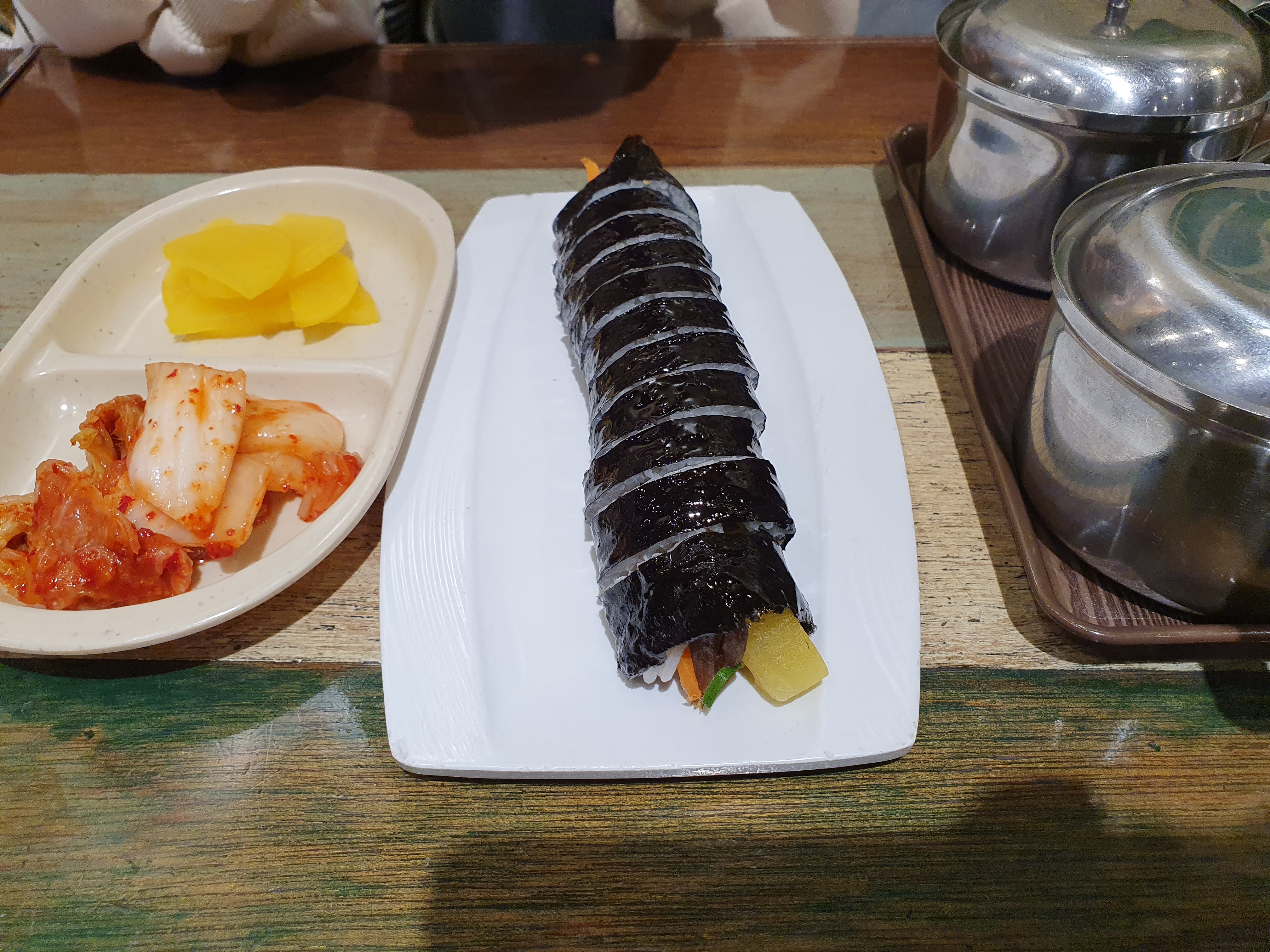 가장 먼저 나온 것은 김밥입니다. 김밥은 주문을 하면 바로 말아서 나오는데요. 요즘 김밥은 기본 2000원이죠. 옛날에는 천원에 먹을 수 있는게 김밥이였는데.. 김밥은 나쁘지 않았습니다. 그런데 단무지가 상태가 좀 별로더라고요. 그래서 단무지를 다 빼고 먹었습니다.