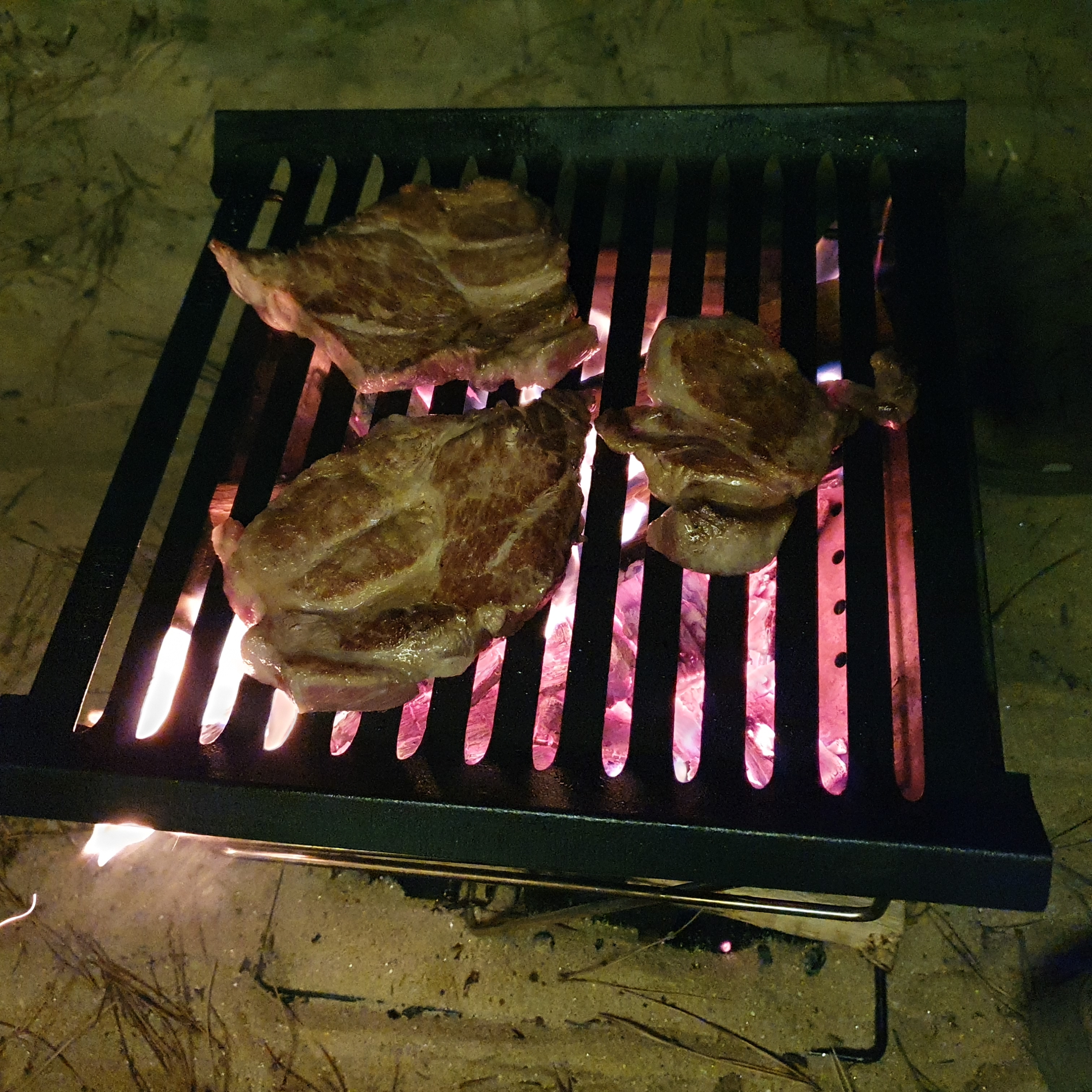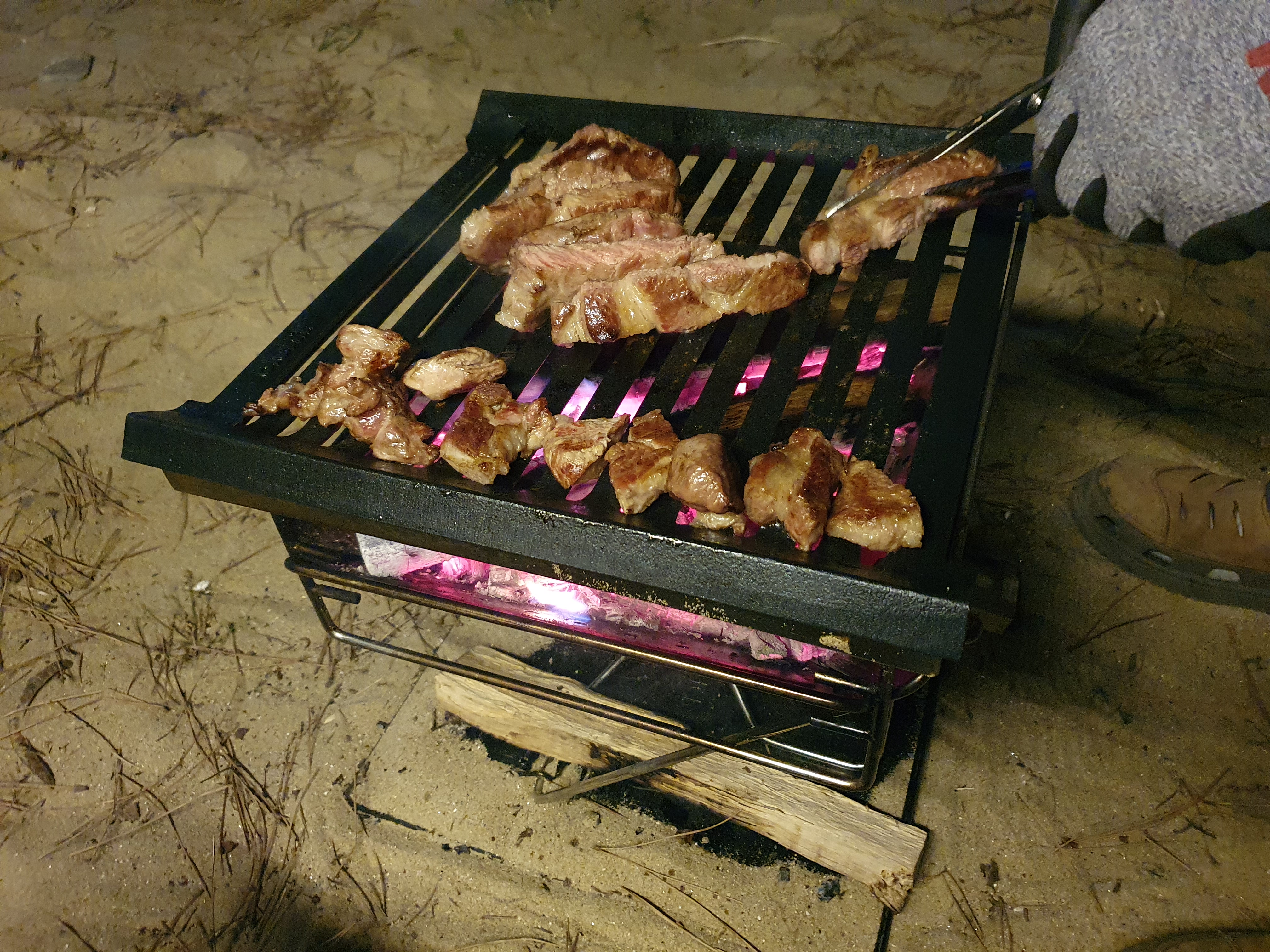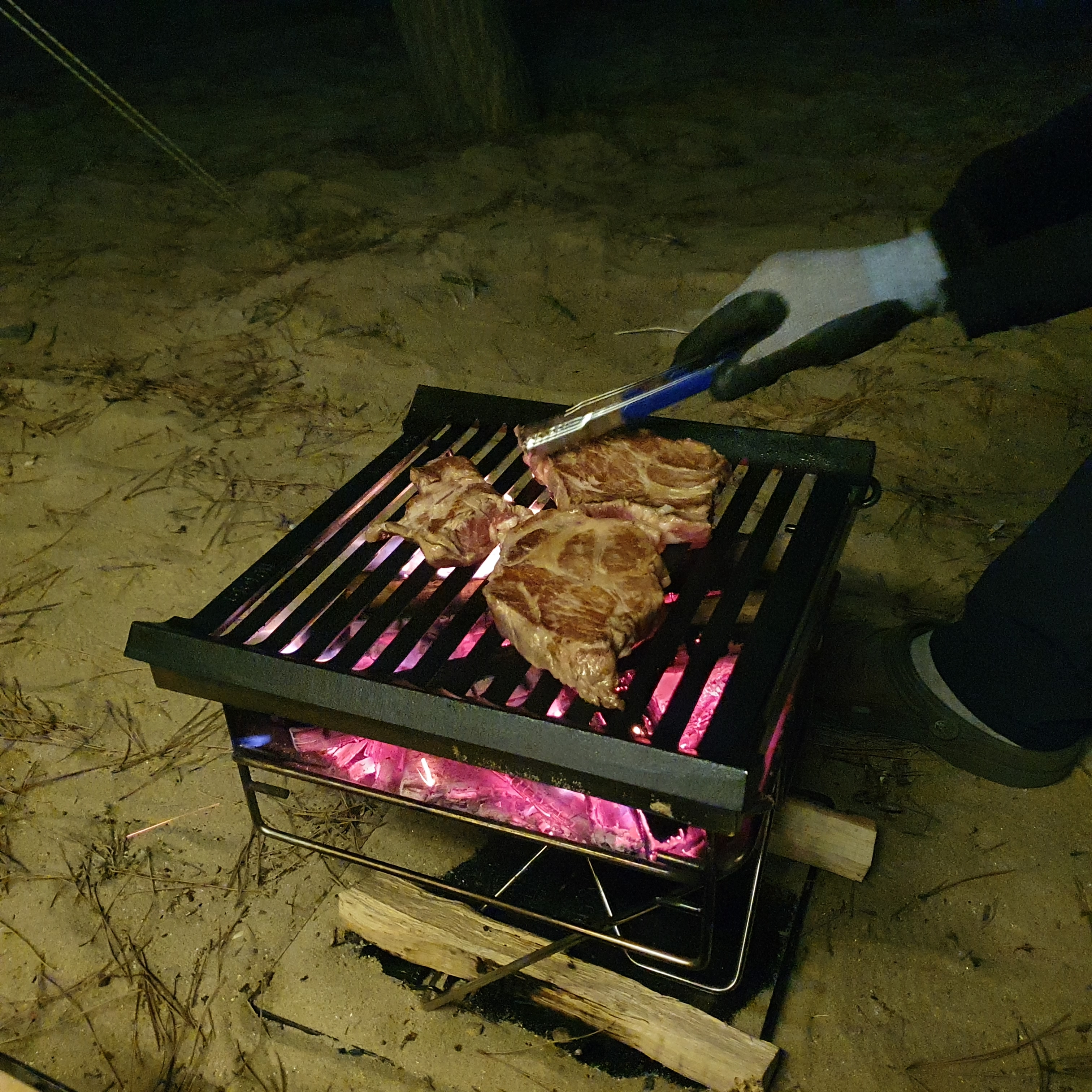 저녁에는 돼지 목살입니다. 캠핑장에서 직화로 고기를 구우며 목살이 정말 최고예요. 정육점에서 두껍게 컷팅해달라고 하고 타지안게 잘 구우면 육즙이 정말 최고예요.