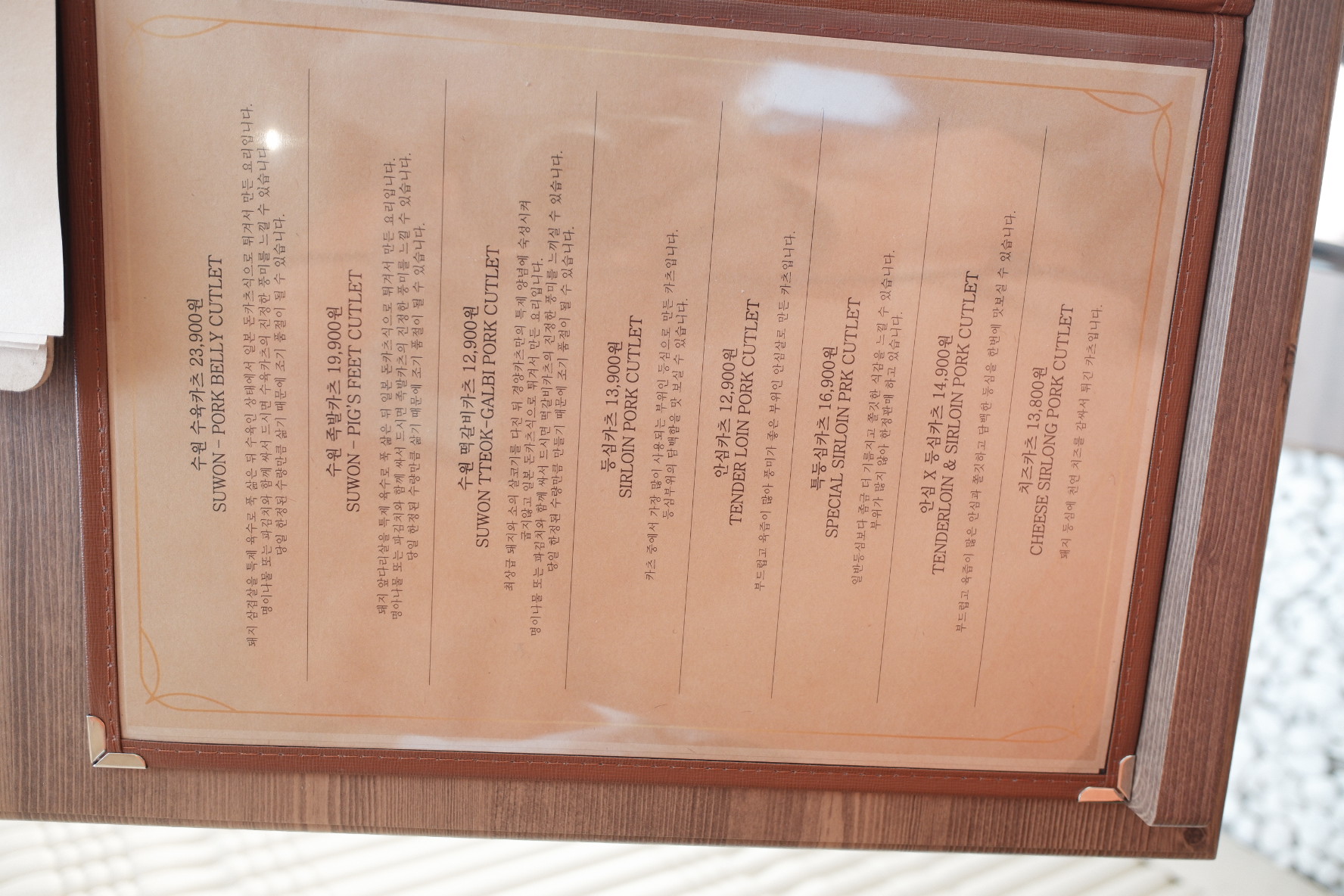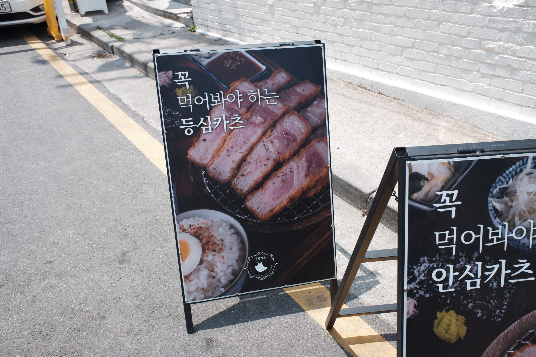 입구 앞에는 입간판이 있고, 메뉴들 사진이 있습니다. 일반적으로 유명한 등심카츠, 안심카츠, 치즈카츠가 있고, 특이한 메뉴로 족발카츠와 수육카츠도 있습니다.