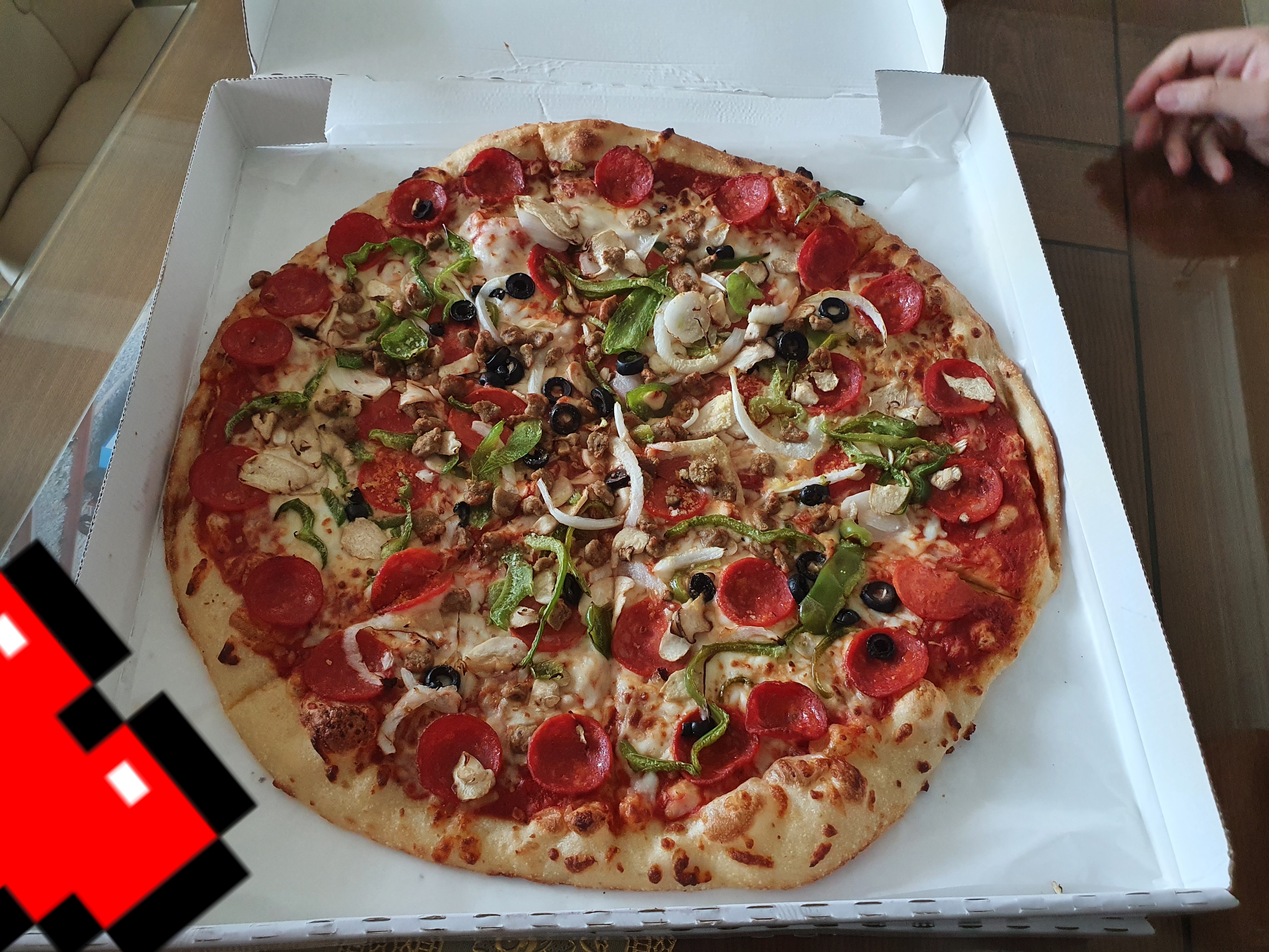 콤비네이션 피자입니다. 페퍼로니가 꽤 많이 들어 있고 버섯, 양파, 피망 등 기본적인 콤비네이션 피자에 들어 있는 기본 재료가 충실하게 들어가 있습니다. 도우는 적당한 두께이고 모서리 부분은 호불호가 있겠지만 디핑소스가 있으면 좋을 것 같네요.
