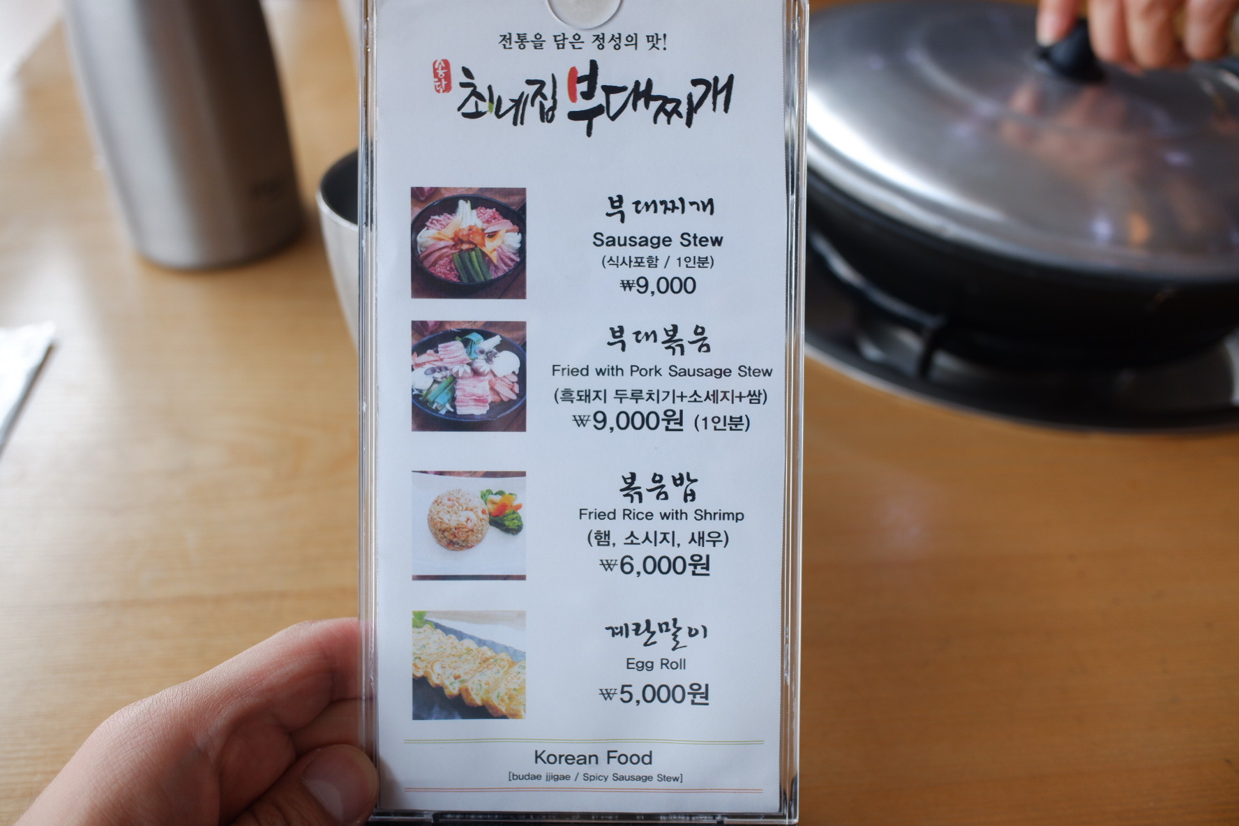 각 테이블마다 메뉴판이 있는데요. 매우 간단한 메뉴들입니다. 부대찌개, 부대볶음이 대표메뉴입니다. 가격은 1인분에 둘다 9000원입니다. 그 밖에 식사 메뉴로 볶음밥도 있고 계란말이도 있네요.