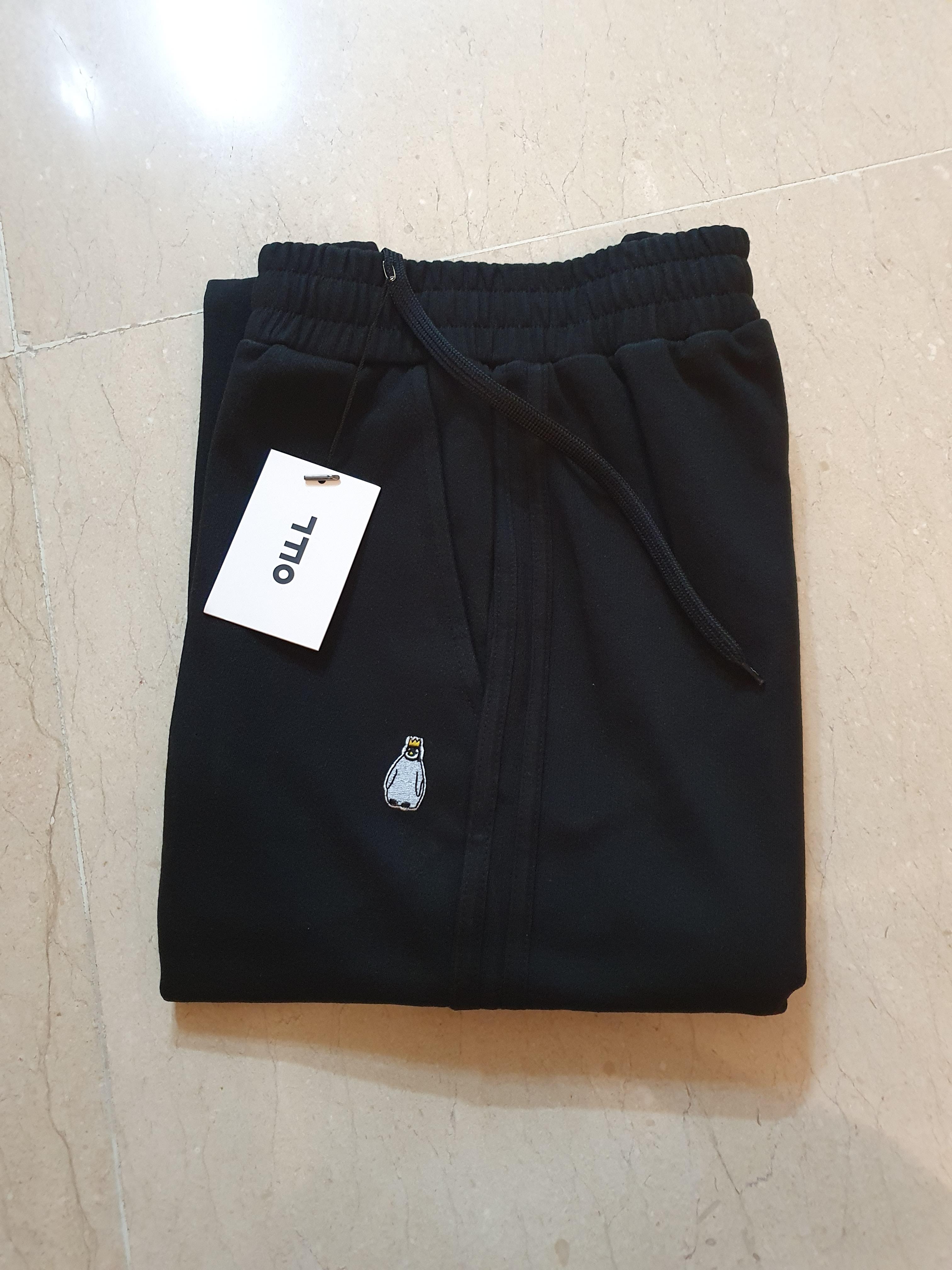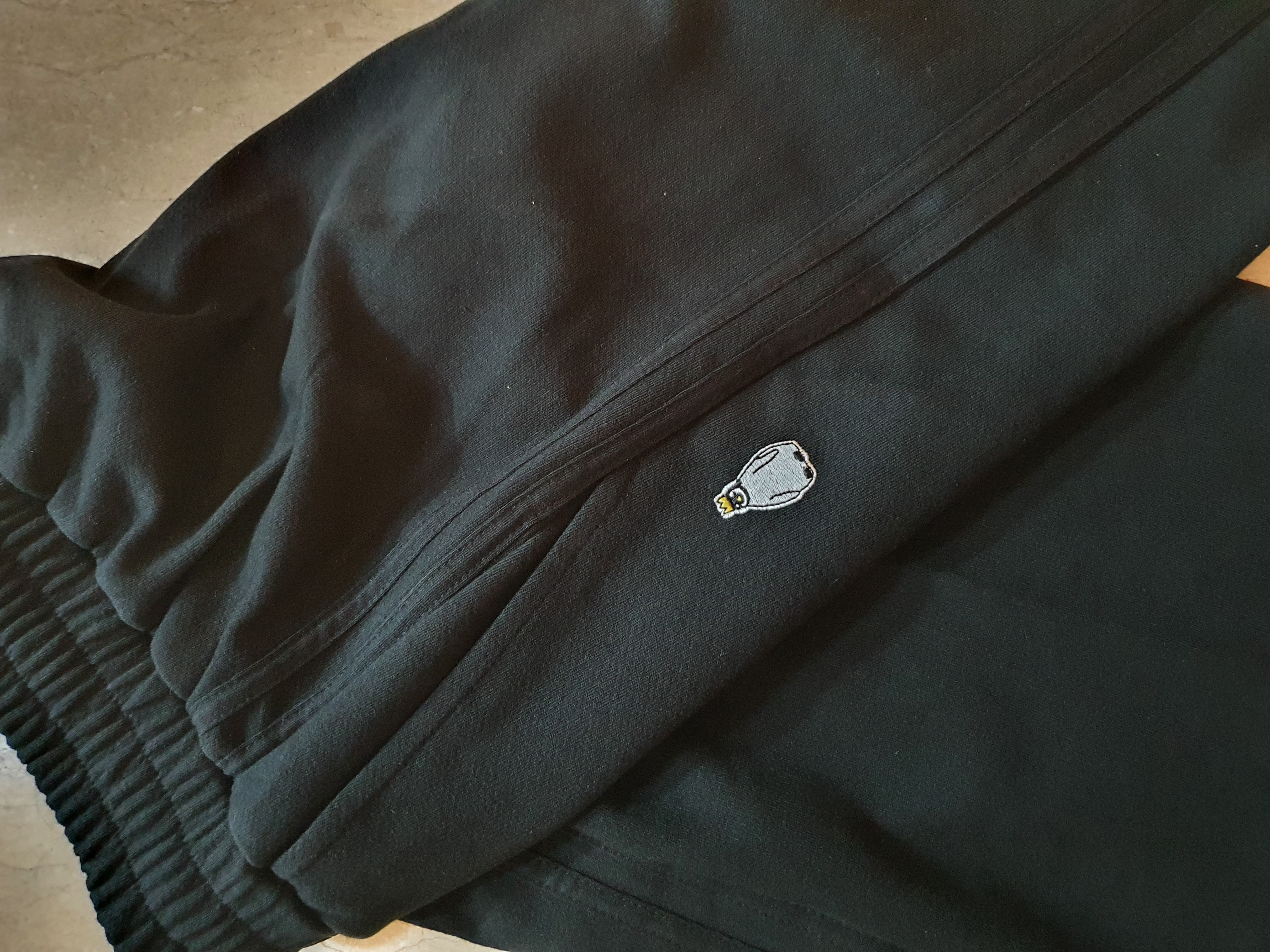 심플한 블랙 컬러에 옆에 라인이 있는데요. 라인도 검은색이라서 잘 눈에 들어오지 않습니다. 없으면 좀 심심하고 너무 눈에 들어오면 부담스러운데, 딱 그 중간을 잘 잡은 것 같아요. 그리고 포켓 옆에 펭귄패치가 붙어 있는데요. 살짝 영한 느낌이 있습니다.