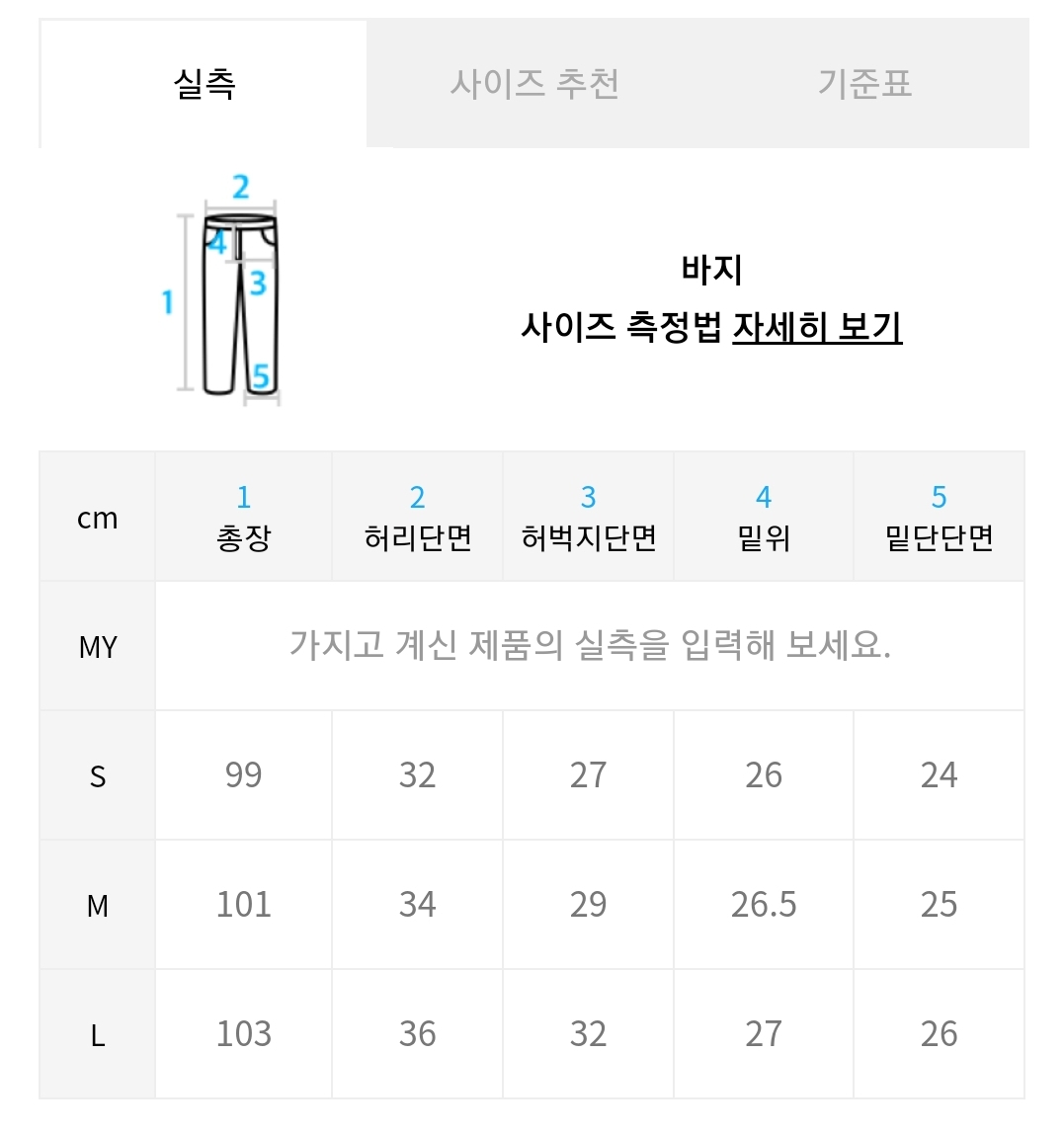 허벅지에서부터 아래로 일자로 길게 와이드하게 내려오는데요. 딱 제가 원하는 느낌입니다. 제가 구매한 사이즈가 L 인데요. 아래 사이즈 표를 참고하시면 될 것 같네요.