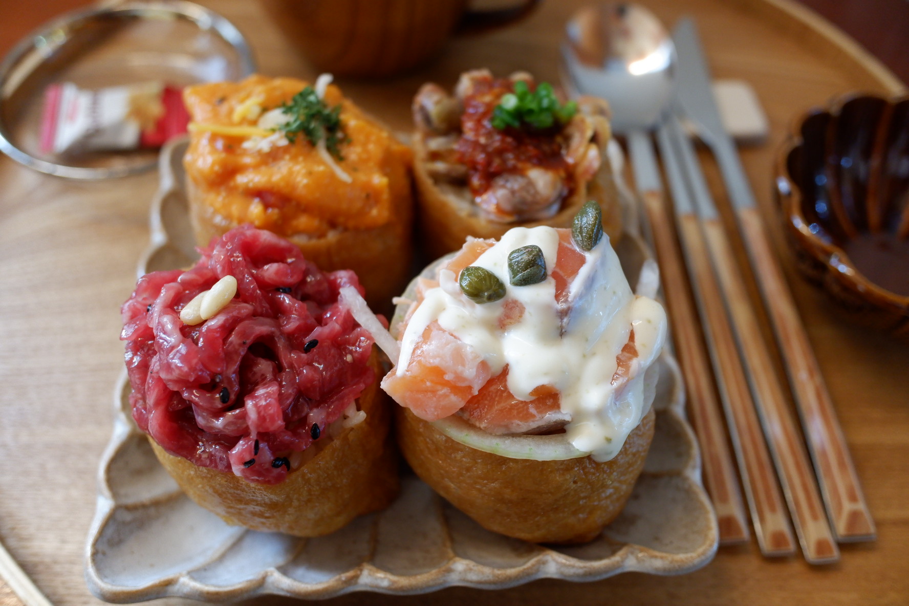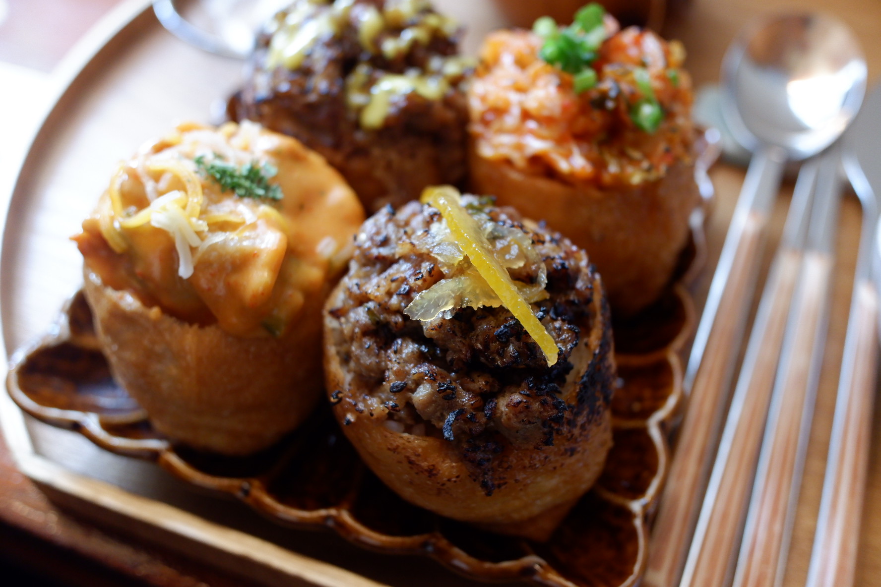 일단 첫번째 접시는 다 맛있어요. ㅋㅋ 근데 뭔가 이쁘긴한데... 그냥 저냥 맛있는데.. 그냥 따로 먹어도 맛있는걸 굳이 유부에 올릴 이유가 있나? 이런 생각이 들었어요. ㅋㅋ 일단 사진으로 나오는 음식은 정말 보기 좋고 먹기 좋게 생겨서 인스타 같은 곳에서 홍보하는데는 효과적일 것 같은데요.