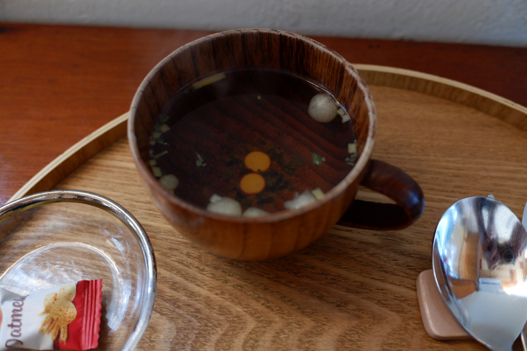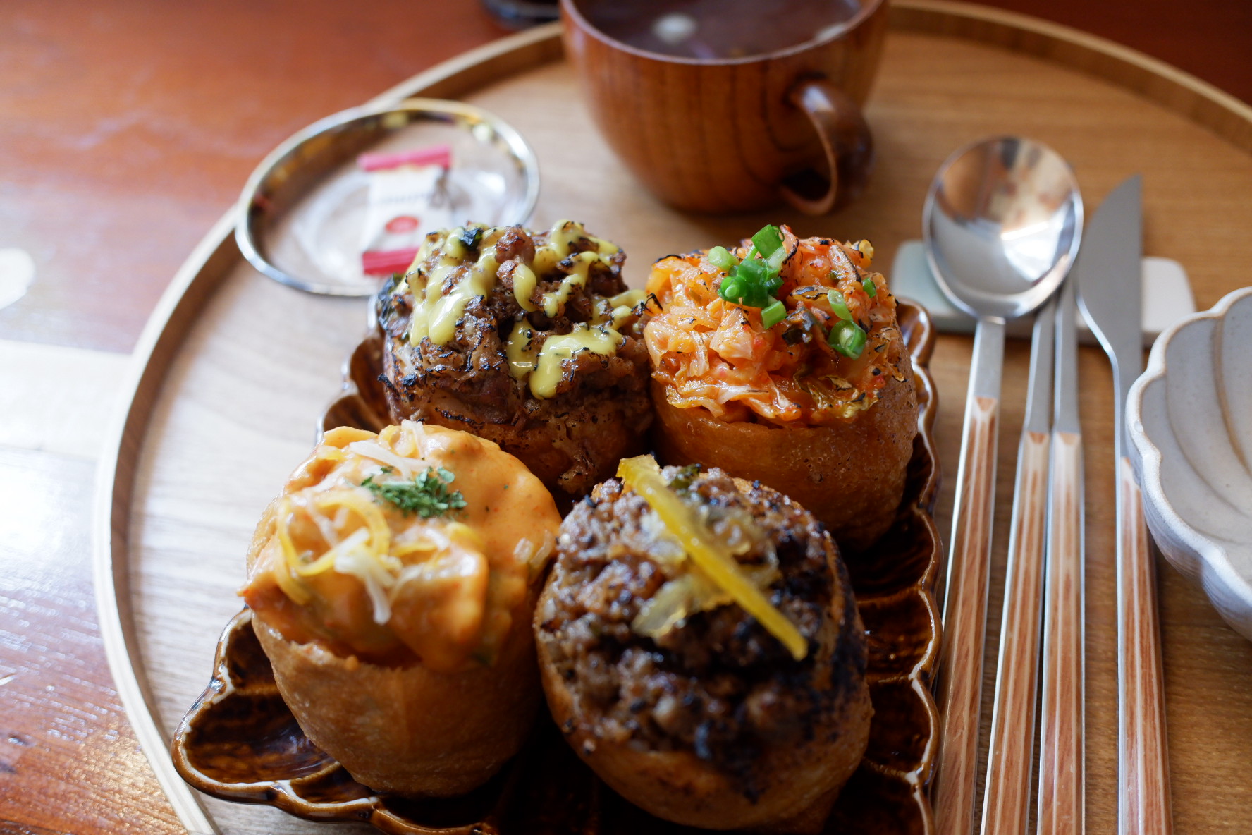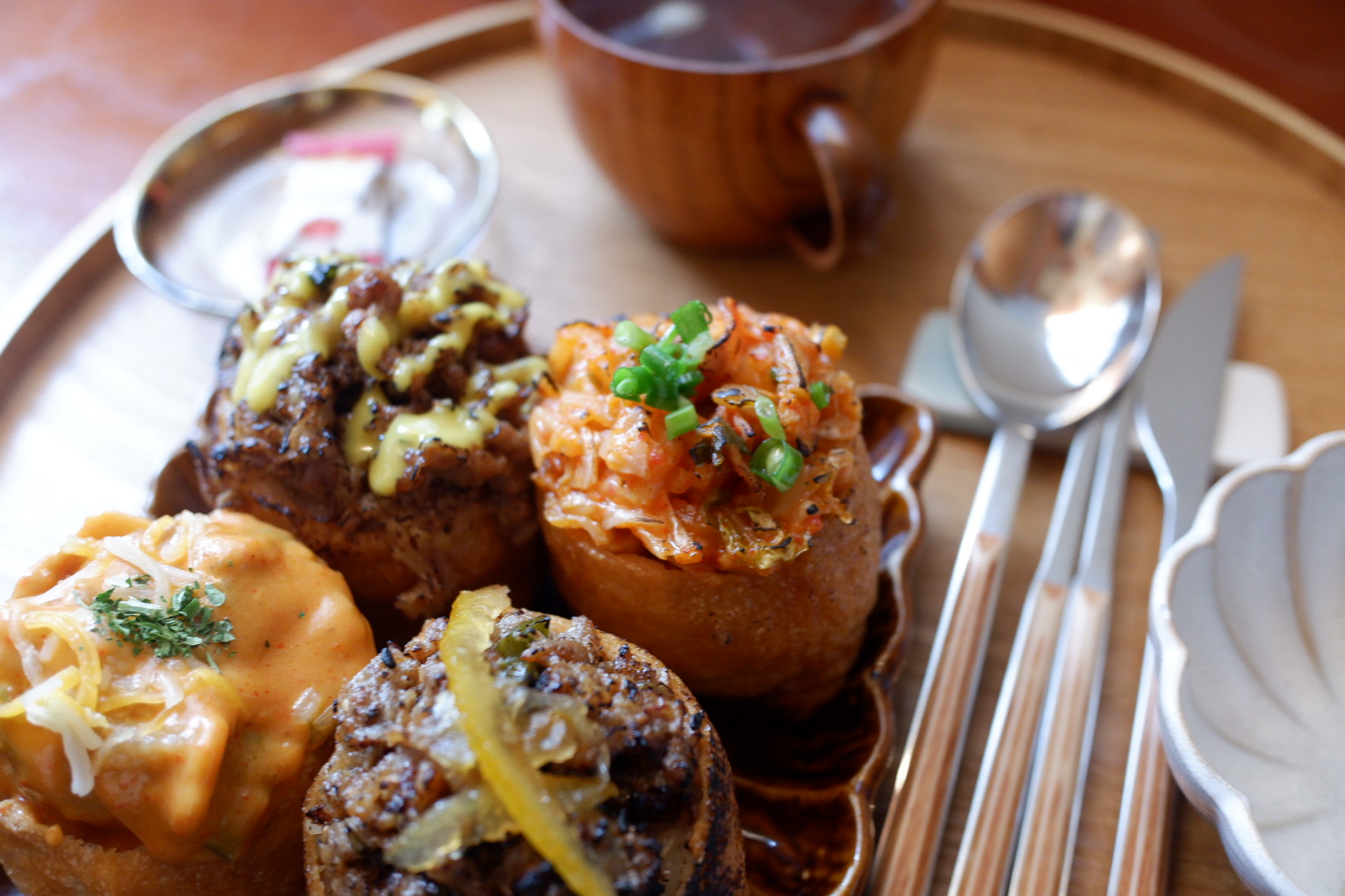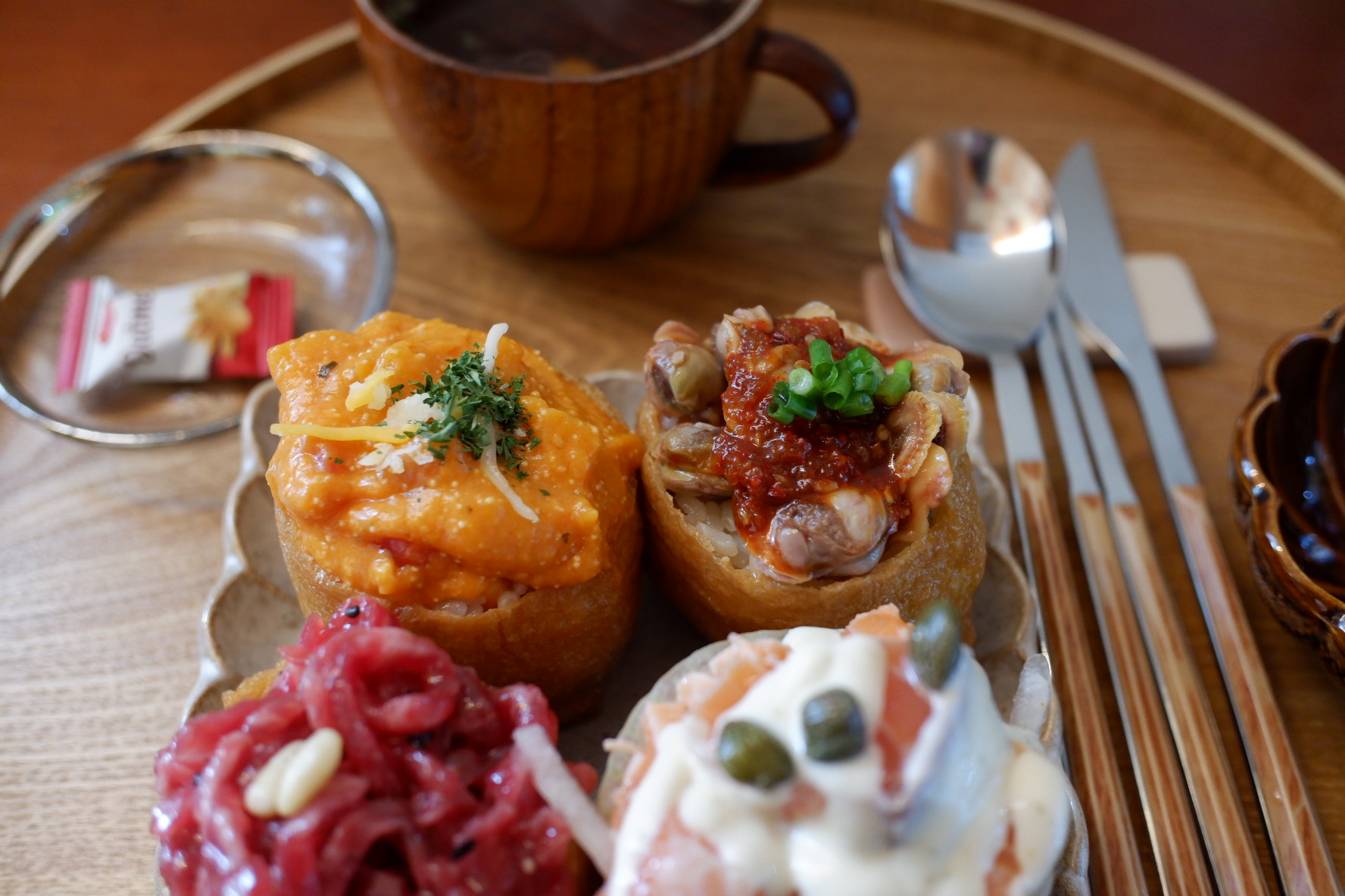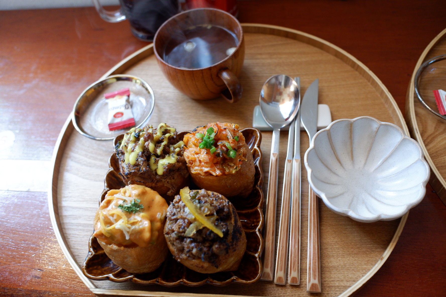 한 접시에 4pc로 구성된 접시가 2개 나왔어요. 각 접시마다 유부초밥과 식기류 그리고 국이 있습니다. 마지막으로 간식으로 사탕도 있어요. 저 오트밀사탕 정말 맛있는데 ㅋㅋ