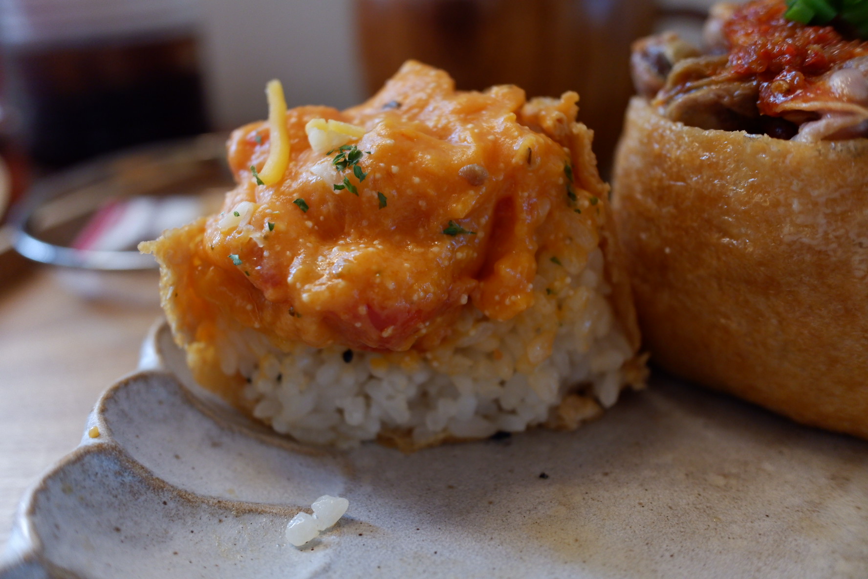 그리고 명란로제는 소스에도 명란이 들어가 있고, 안쪽에도 명란이 있습니다. 로제소스랑 명란이 생각보다 잘 어울렸고, 로제소스가 밥이랑 잘 어울리면서 진한맛을 느낄 수 있어서 좋았습니다. 명란 특유의 냄새는 전혀 없었고, 소스로 잡내를 잘 잡았다는 느낌이 들었습니다.