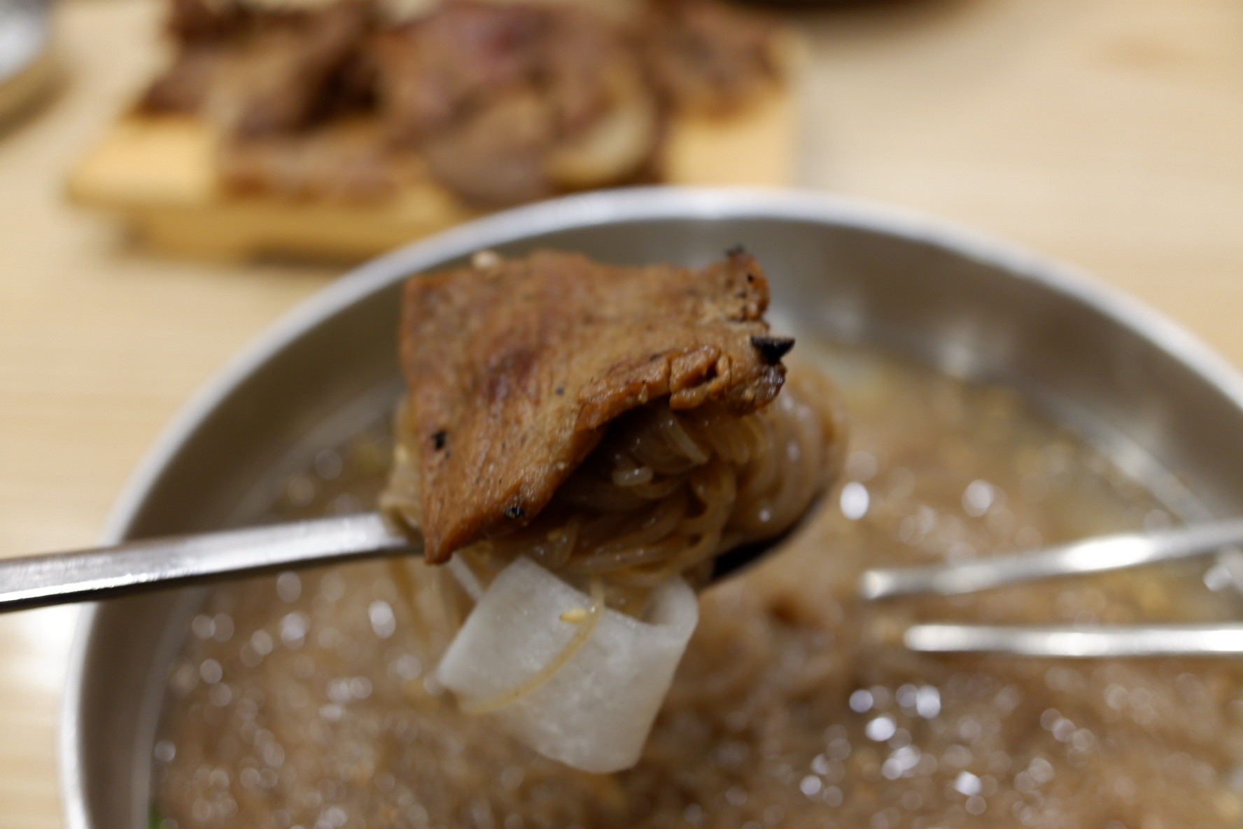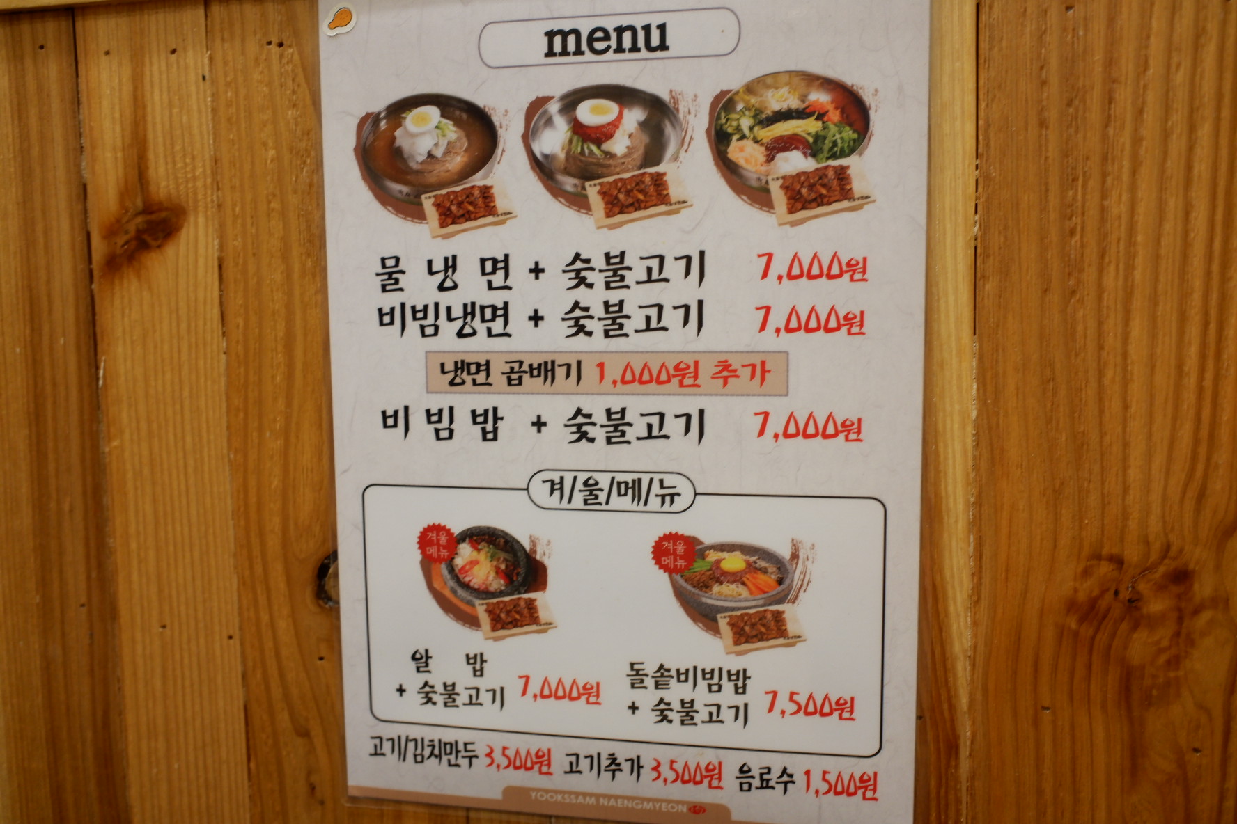 메뉴는 정말 심플한데요. 곱배기를 하게 되면 1000원이 추가됩니다. 저는 이곳에 오면 항상 물냉면에 숯불고기를 주문했습니다. 가격은 7000원입니다.