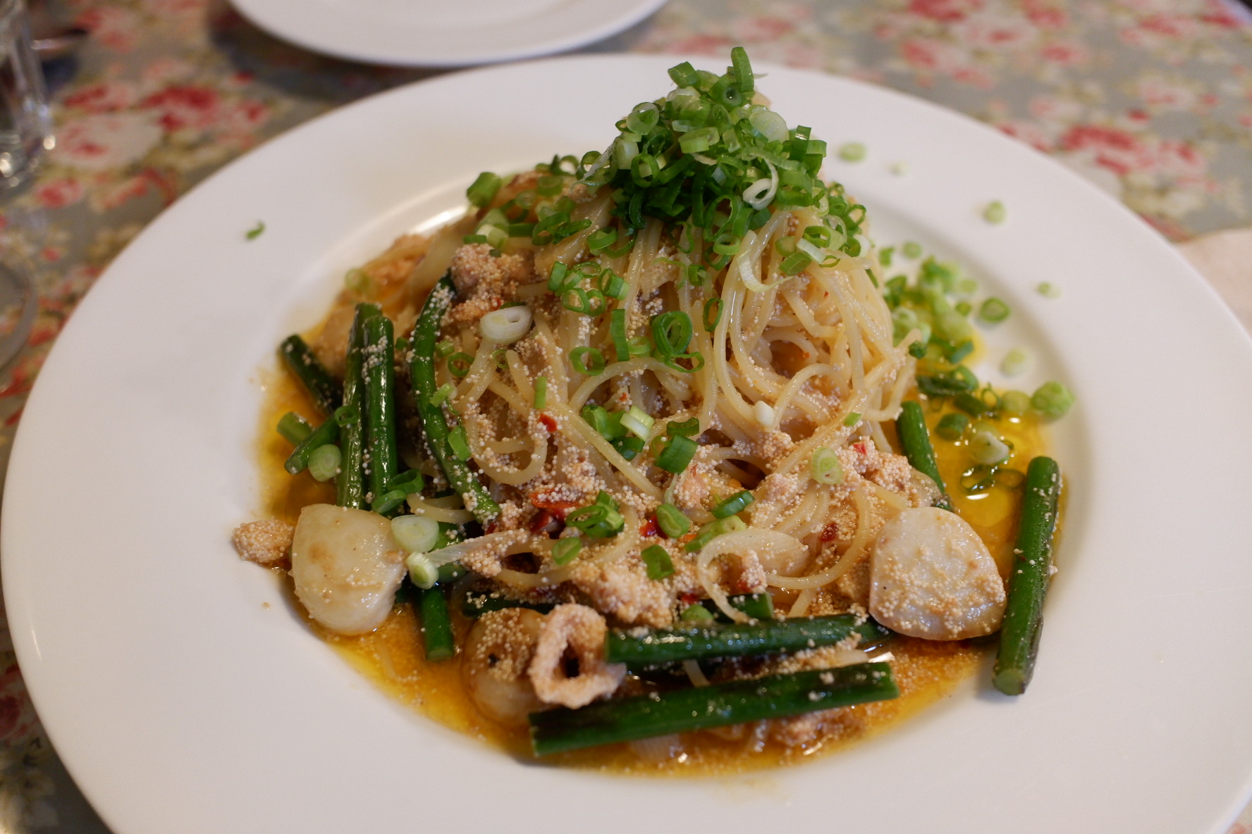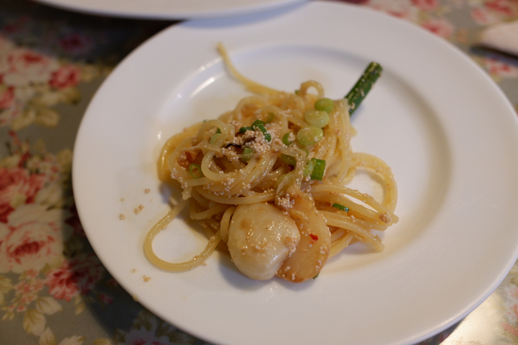 먼저 나온 음식이 명란 파스타입니다. 알리오올리오랑 비슷한 느낌의 파스타인데요. 마늘과 마늘쫑 그리고 명란이 들어가서 일반 파스타와는 확실히 다른 맛이 나는데요. 저는 개인적으로 퓨전 느낌의 파스타보다는 오리지날 파스타가 좋긴 하지만 이것도 먹을만 해요.
