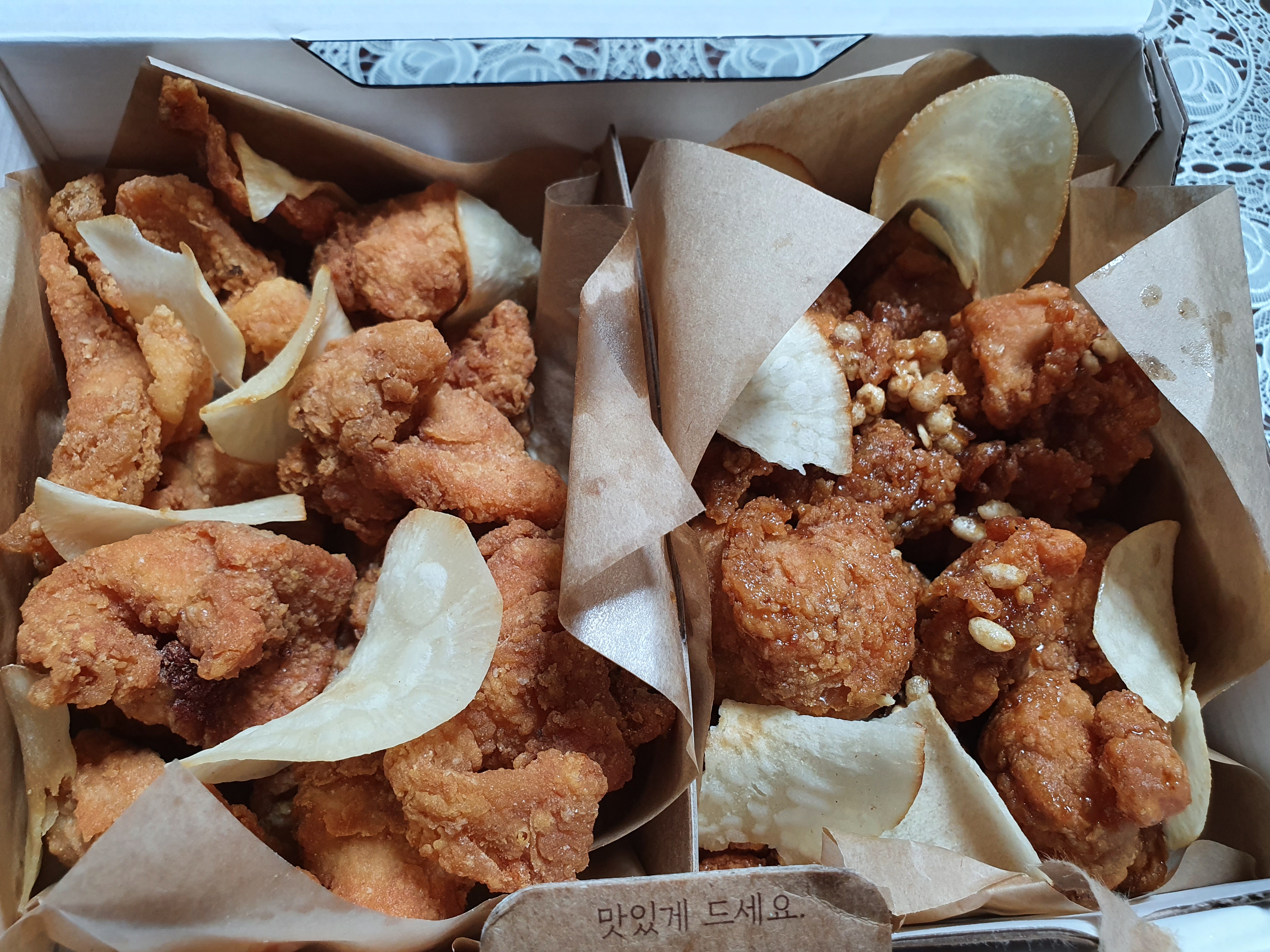 왼쪽이 현미바사삭이고 오른쪽이 통곡물 간장 치킨입니다.
