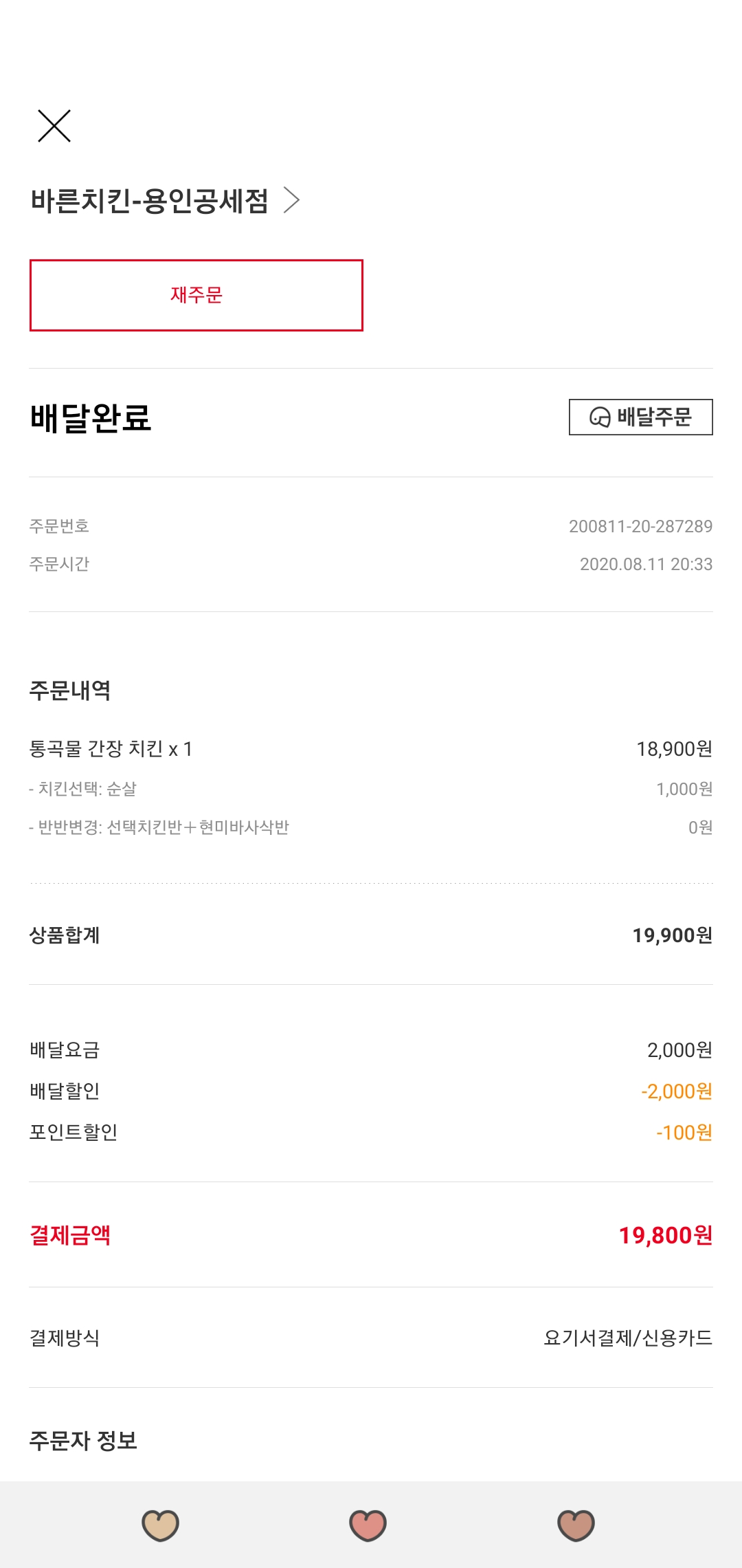 가격은 18900원에 순살이기 때문에 1000원이 추가되었습니다. 여기에 배달비가 2000원이 추가되었지만, 할인을 받았습니다.
