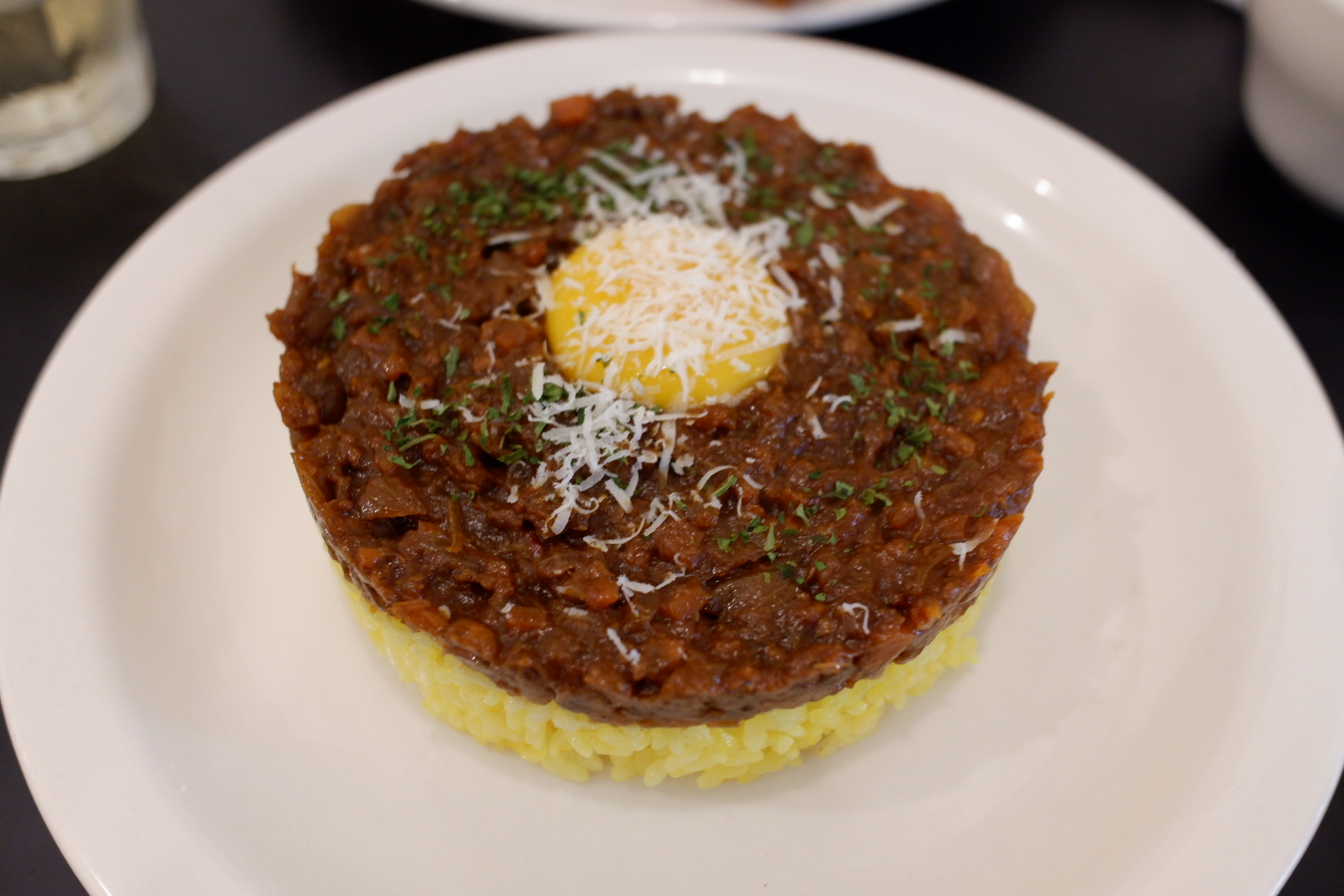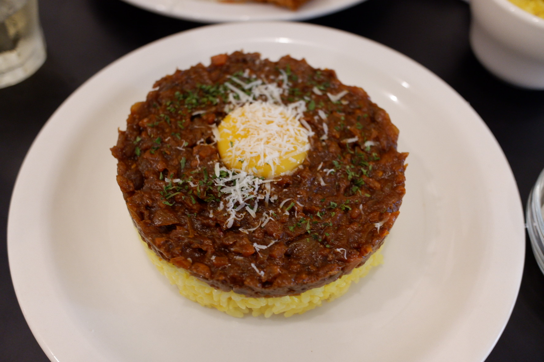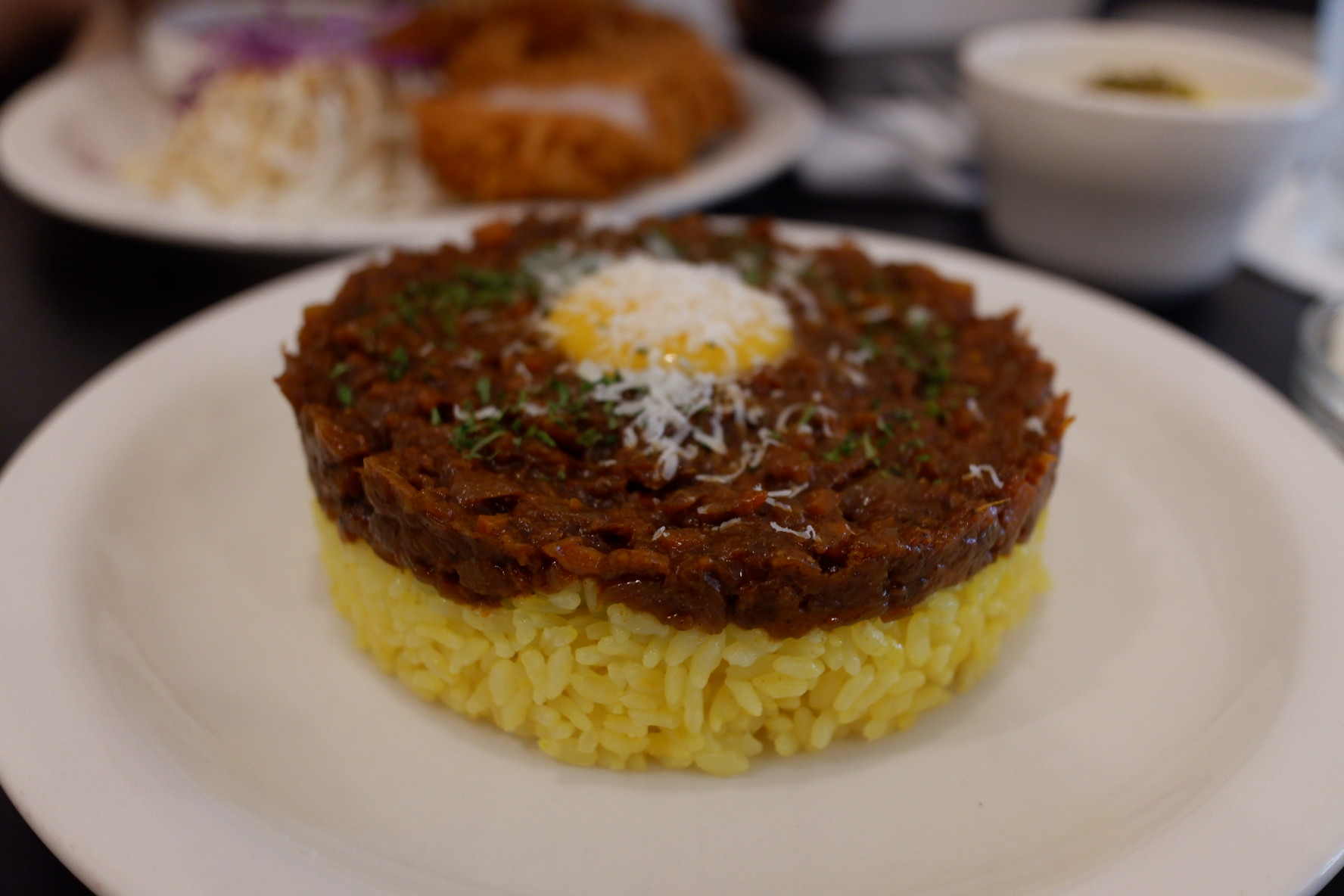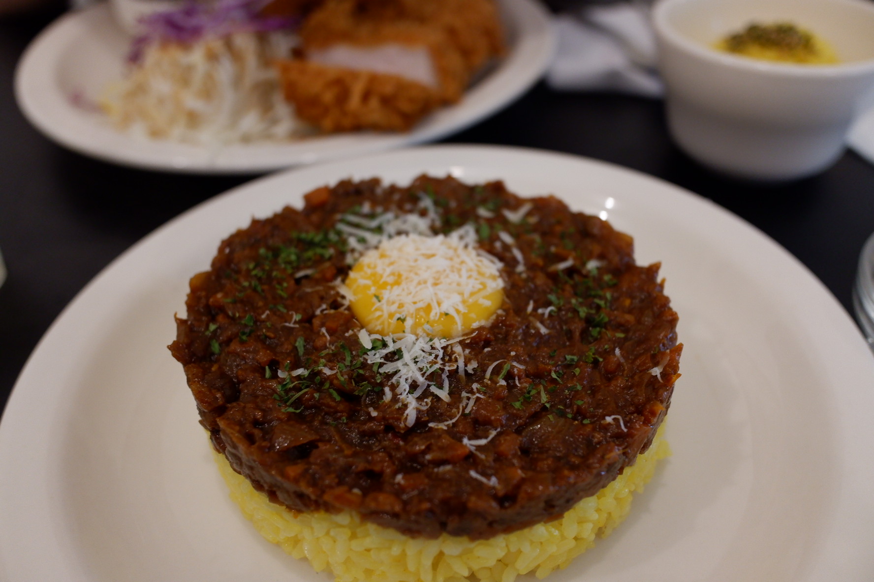 그리고 카레는 일반카레랑 차원이 다른 생김새인데요. 키마 카레라고 하는데요. 묽어서 흐르는 카레가 아니고 뚜덕한 카레입니다. 그리고 가운데 노른자가 있고, 치즈가루와 파슬리가 올라가 있습니다.