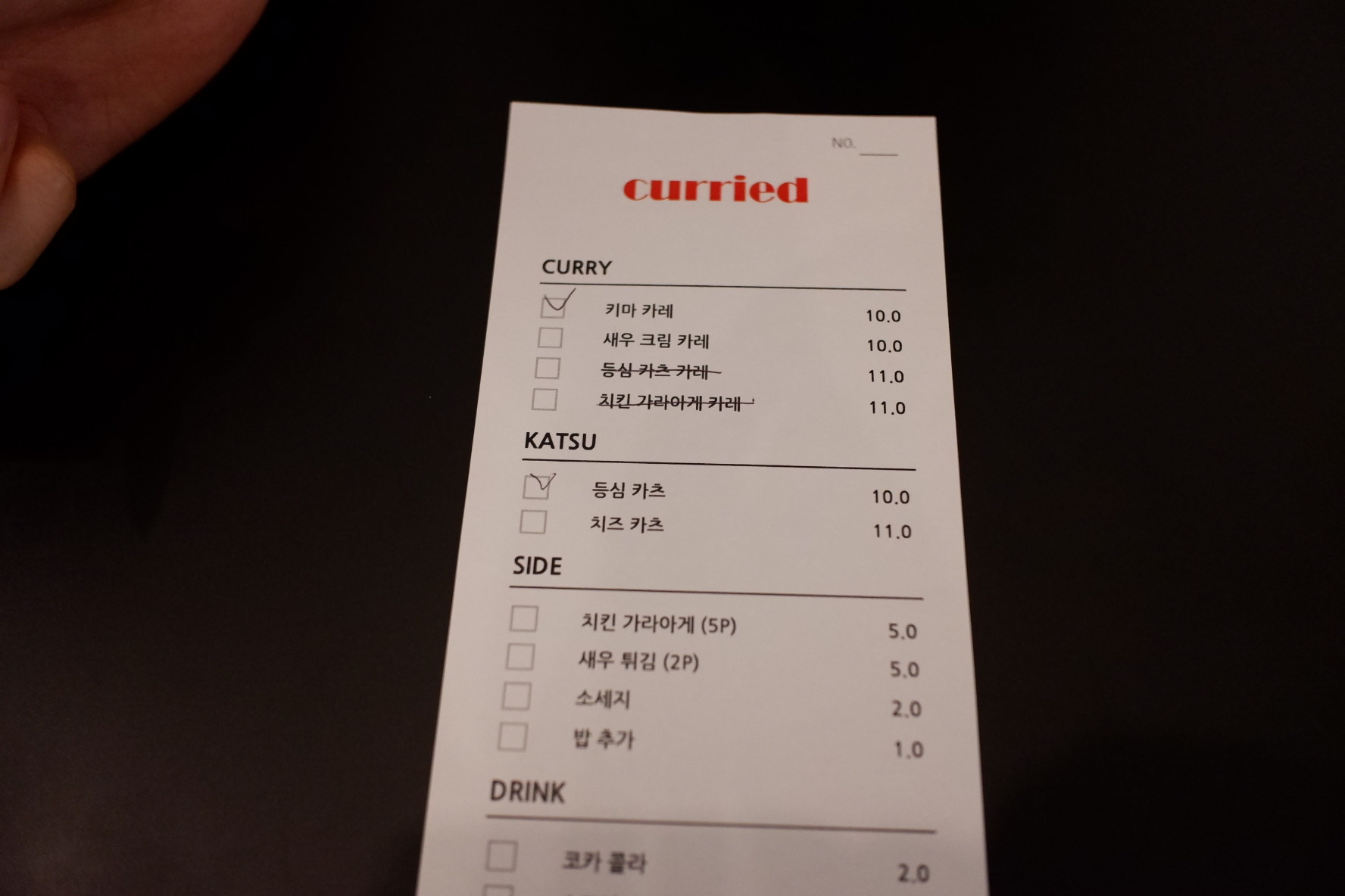 따로 메뉴판은 못봤어요. 그냥 주문표에 원하는 메뉴를 체크하면 되는데요. 메뉴는 카레, 카츠, 사이드가 있습니다.